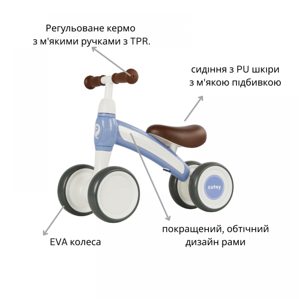 Біговел QPlay CUTEY з 4 дуже стійкими колесами для забезпечення балансу малюків. Колеса зроблені з гуми, тому вони краще прилягають до всіх поверхонь і не видають шуму. Ручки виготовлені з нековзної гуми.Характеристики:Для дітей від 10 місяців до 3-х роківМаксимальний вага-20 кгРучка регулюється - 2 положенняКолеса з матеріалу EVAМ'яке сидінняГумові ручки керма