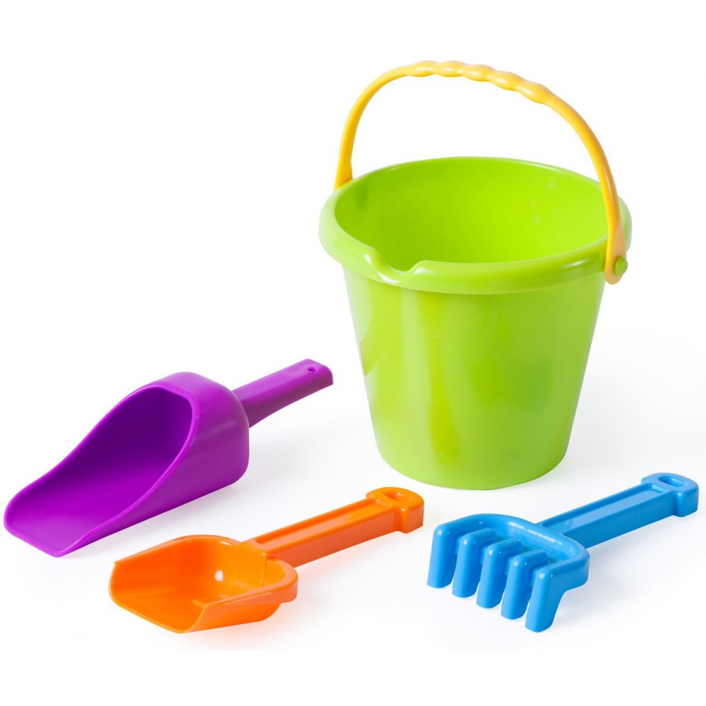 У набір входять цебро, лопатка, грабельки та совок. Усі деталі можна зберігати у відрі. Ручки всіх елементів набору спеціально адаптовані під розміри руки маленької дитини.
