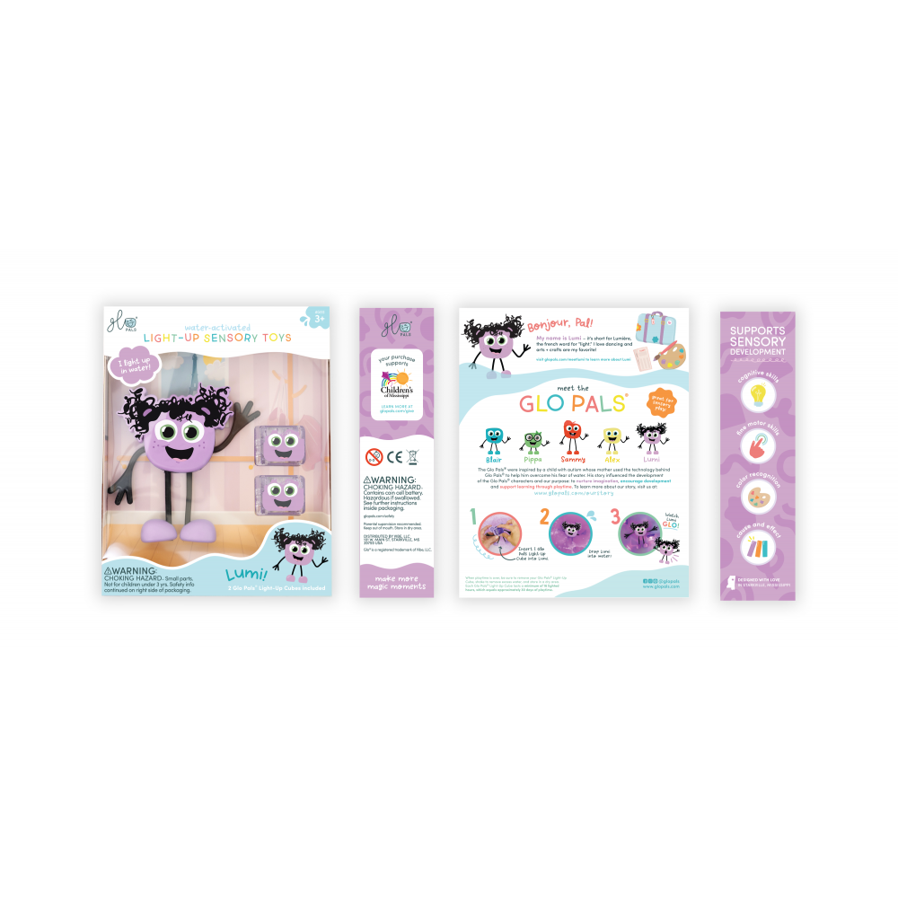 Персонаж із серії Glo Pals включає 2 світлові кубики, виготовлені зі 100% переробленого пластику. Вставте світловий куб Glo Pals у задню частину фігурки, опустіть її у воду — і вона засвітиться, перетворюючи звичайну гру у воді на справжню сенсорну пригоду.