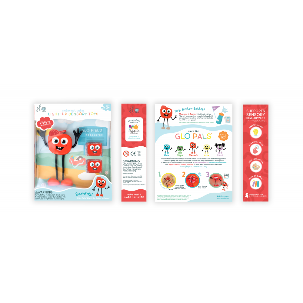 Персонаж із серії Glo Pals включає 2 світлові кубики, виготовлені зі 100% переробленого пластику. Вставте світловий куб Glo Pals у задню частину фігурки, опустіть її у воду — і вона засвітиться, перетворюючи звичайну гру у воді на справжню сенсорну пригоду.