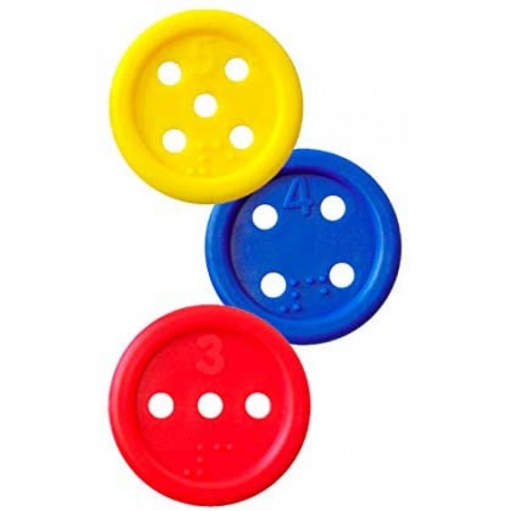 Набір складається з великих кольорових ґудзиків і шнурочків. На кожному ґудзичку зображено його число і еквівалент мовою Брайля. Кількість отворів збігається із зображеною цифрою.