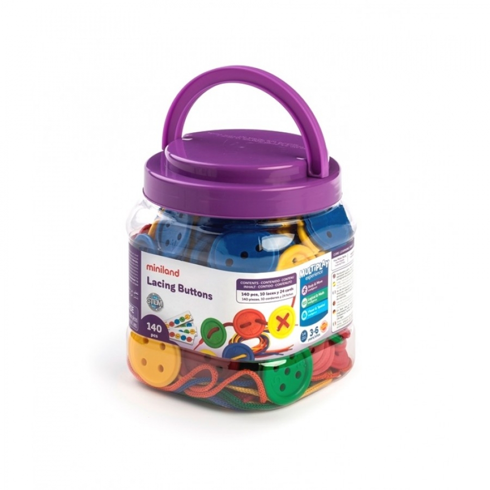 Набір ґудзиків і шнурків для шнурування Miniland в банці, 140 шт.