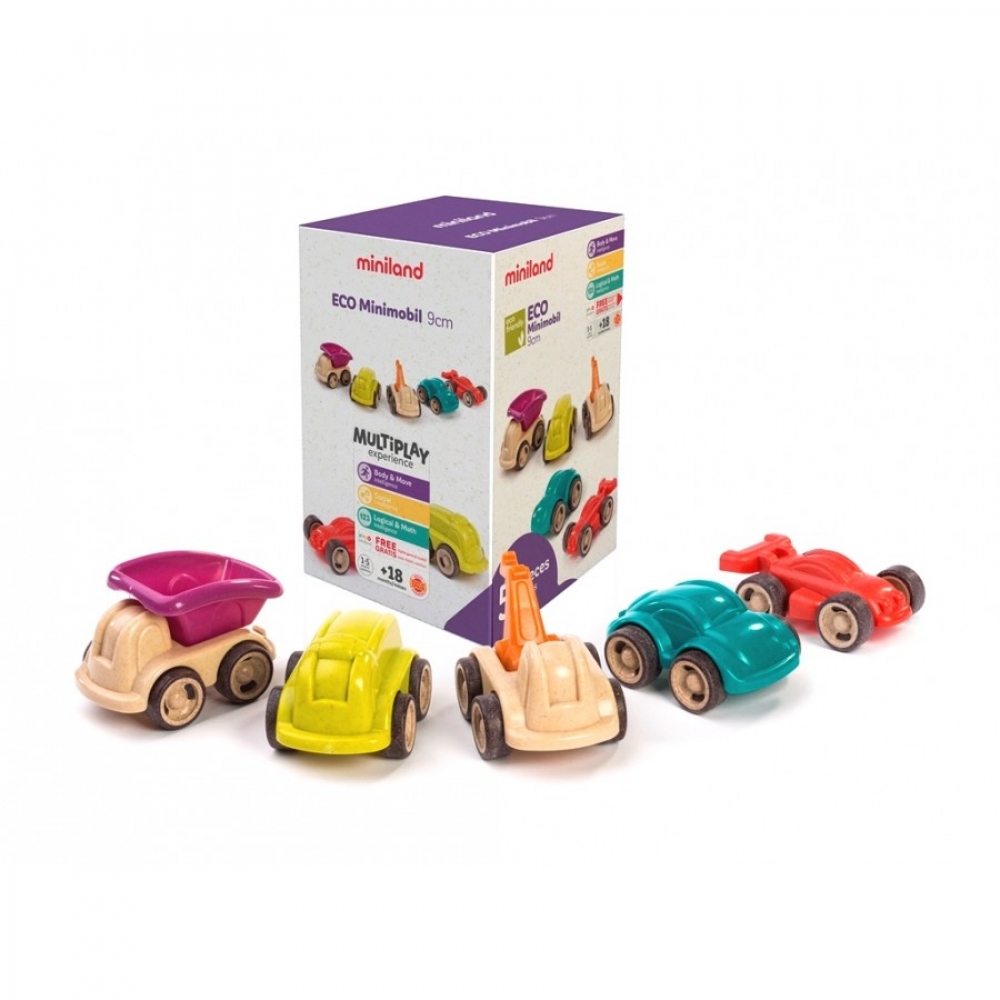Miniland Eco Minimobil - це набір класичних машинок, зроблених з екологічно чистих матеріалів, які знижують вплив на навколишнє середовище. У складі 60% деревних волокон і 40% пластика. Завдяки такому складу легко привчити малюка відповідально ставитися до природи. При цьому автомобілі мають високу міцність, зносостійкість і гігієнічність. Колеса у машинок незнімні.