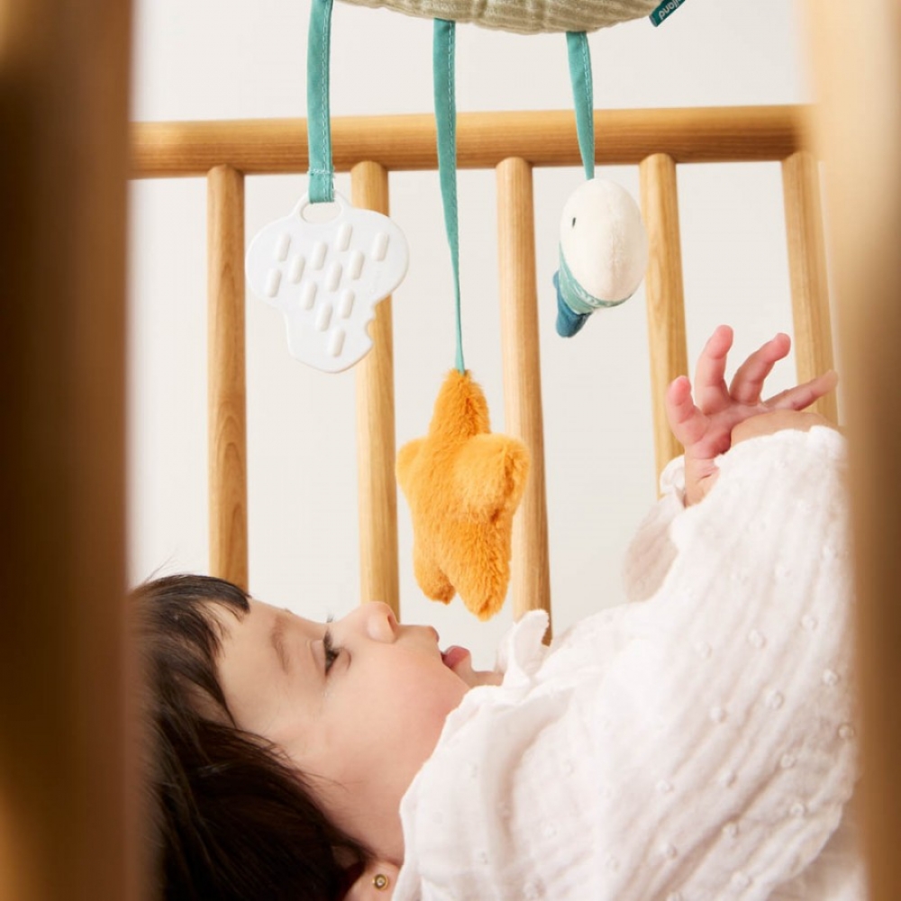 Різні текстури та елементи підвіски пробуджують інтерес малюка та допомагають поступово розвивати його дотик, зір та слух.