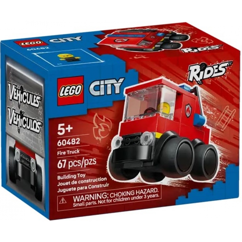 LEGO City Автівки — Пожежна машина (60482) — компактний набір для дітей від 5 років, що дозволяє зібрати пожежну машину з масивними гумовими шинами, підйомною драбиною та полум'яною вихлопною трубою. Набір містить мініфігурку юного пожежника LEGO City Rides для швидких рольових ігор. Це ідеальний вступ у світ LEGO City для маленьких любителів машинок, відеоігор чи конструкторів. Після збірки модель можна поєднувати з іншими наборами LEGO City для розширених пригод. Містить 67 деталей та інструкції в додатку LEGO Builder з 3D-переглядом.