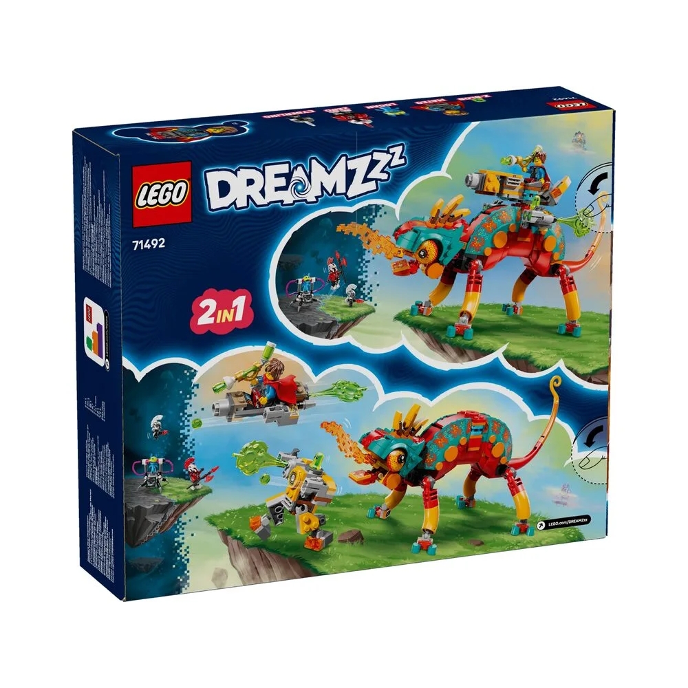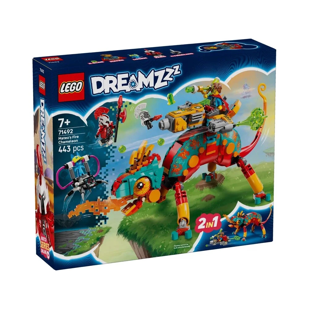 LEGO DREAMZzz 71492 «Вогняний хамелеон Матео» — яскравий і динамічний набір для дітей від 7 років з 443 деталями, що дозволяє зібрати вогняного хамелеона-охоронця з бластерною туреллю та 4 шиповими шутерами або перетворити його на реактивний літак з мініфігуркою робота. Іграшковий хамелеон має повністю рухомий рот, голову, хвіст, очі та кінцівки, а модульні прискорювачі сумісні з іншими наборами LEGO DREAMZzz колекції 2025 року (продаються окремо). У комплекті мініфігурки Матео (з захисним плащем Z-Blob) та Зеро, а також фігурки Лоґана, Z-Blob і Кіборга для епічних сюжетних пригод — рятування Лоґана від лиходія Зеро. Набір розвиває творчість, уяву, дрібну моторику та надихає на власні історії про захист мрій і фантастичні битви. Додаток LEGO Builder пропонує сюжетні інструкції, 3D-перегляд та режим «Складаймо разом» для спільної гри з друзями чи родиною. Чудовий подарунок для фанатів серії DREAMZzz та юних супергероїв.