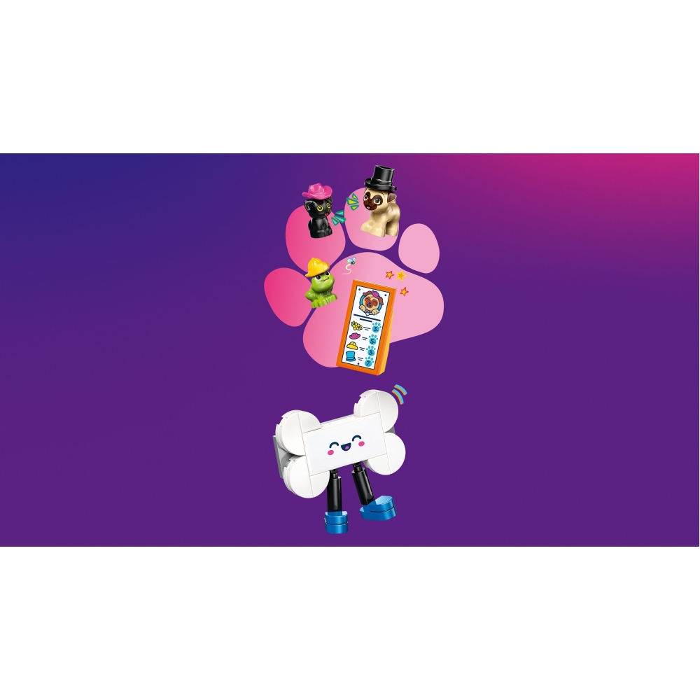 LEGO Friends 42678 — набір для дітей від 6 років із фургоном у формі мопса, що махає хвостом під час руху, двома мініляльками, фігурками кошеняти, собаки та жаби. У комплекті аксесуари для тварин: різні капелюхи (дощовий, ковбойський, циліндр, вінок з квітів), талісман у вигляді кістки та інші деталі для показу мод для улюбленців. Діти можуть розігрувати сюжети про завантаження фургона, демонстрацію аксесуарів та пригоди з тваринами. Додаток LEGO Builder з 3D-інструкціями спрощує процес складання. Підходить для розвитку уяви через рольові ігри про тварин та моду.