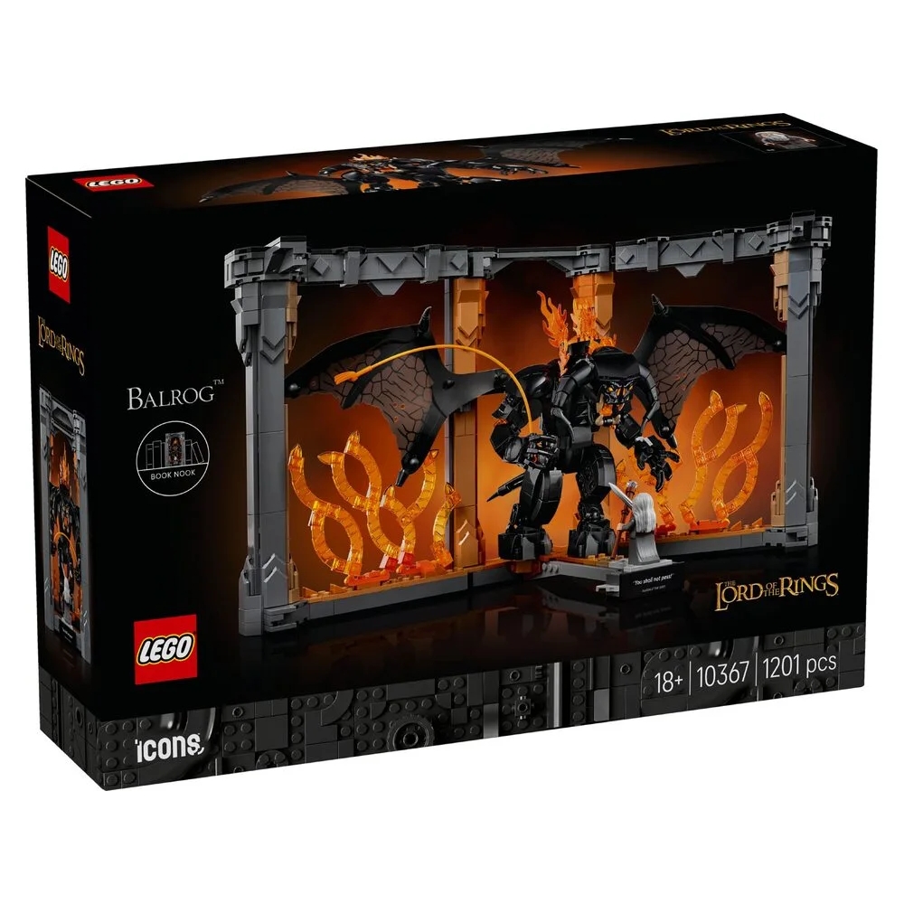 Конструктор LEGO Icons «Володар перснів: Балроґ. Книжковий куточок» 10367 відтворює сцену з протистоянням Балроґа та Ґендальфа. Набір орієнтований на дорослу аудиторію та поєднує декоративну й колекційну функції. Композиція оформлена у форматі книжкового куточка для розміщення на полиці. Деталізована конструкція передає атмосферу підземного світу Морії. Модель призначена для демонстрації в інтер’єрі.
