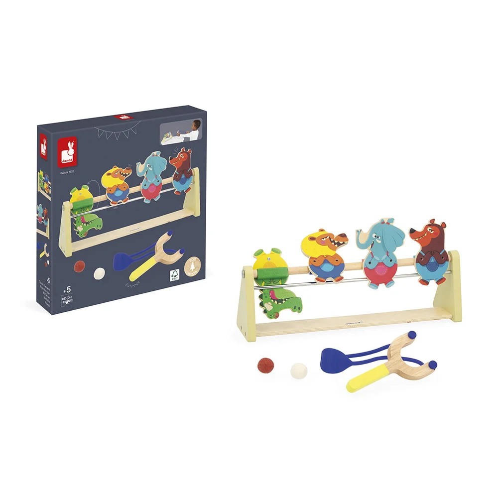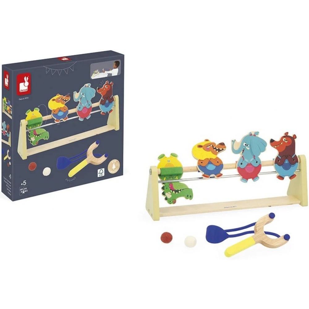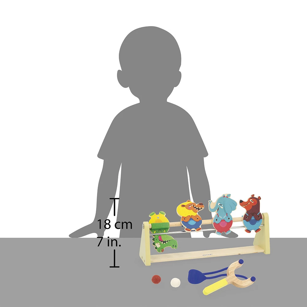 Дерев’яна гра на спритність для дітей від 5 років. Запускайте фетровим м’ячиком із рогаткоподібного запускачa й збивайте магнітні тварини-мішені заввишки 11 см, дистанцію можна змінювати під рівень складності. У комплекті 2 м’ячі. Деревина з сертифікацією FSC™.