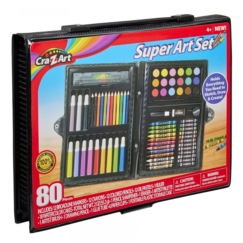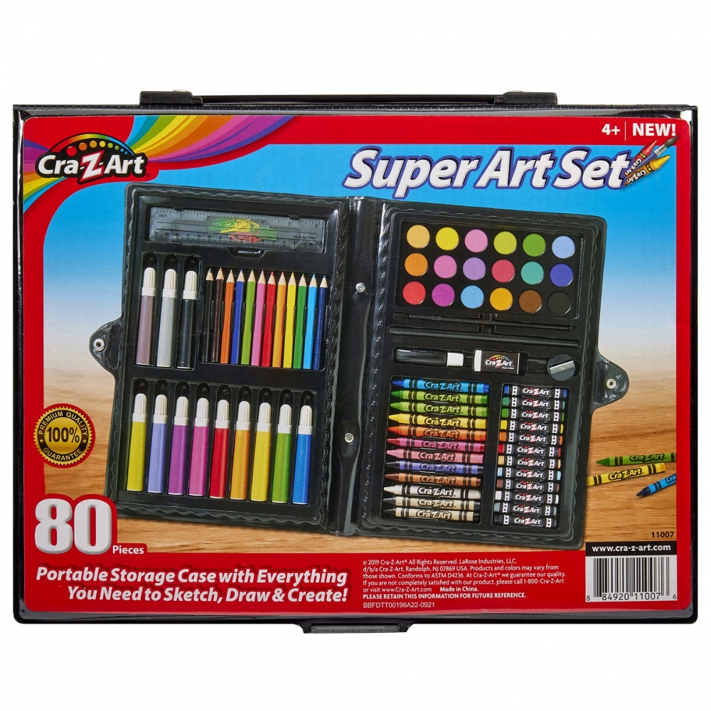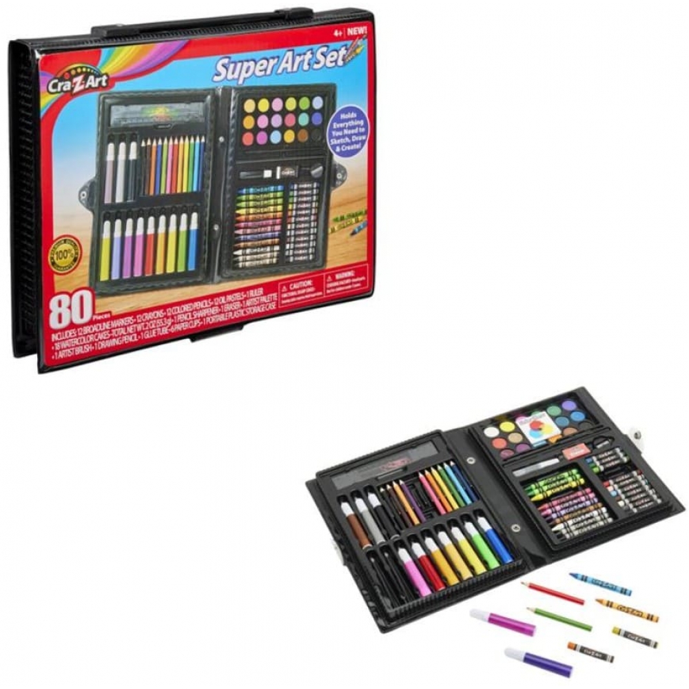 Набір для творчості Cra-Z-Art на 80 предметів являє собою художній комплект для малювання, розфарбовування та створення творчих проєктів. У наборі передбачені маркери, воскові крейди, кольорові олівці, масляні пастелі та акварельні фарби. Усі елементи розміщені у портативному кейсі, що використовується для зберігання та транспортування художніх матеріалів.