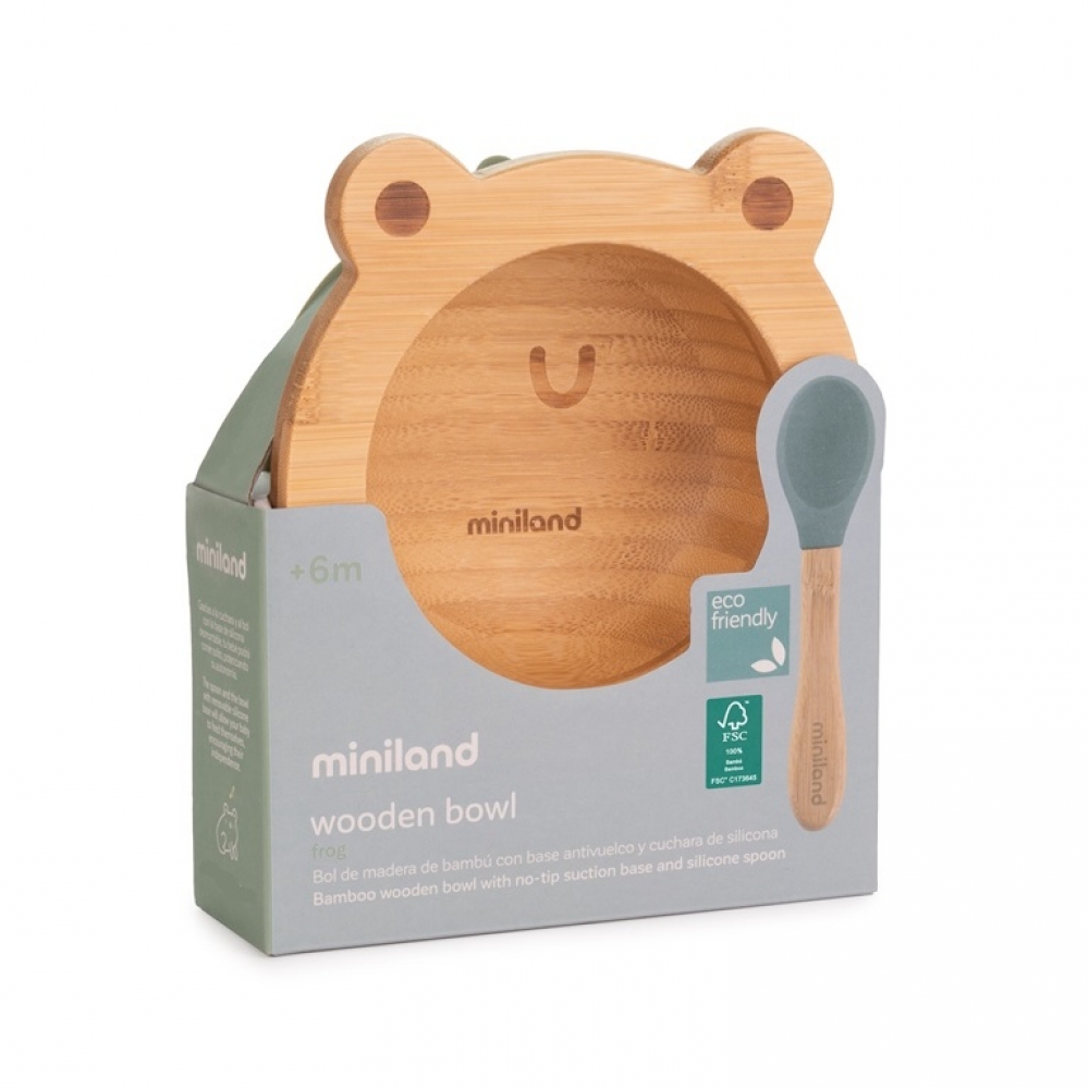 Дитяча бамбукова тарілка на присосці з ложкою Miniland Wooden Bowl Frog