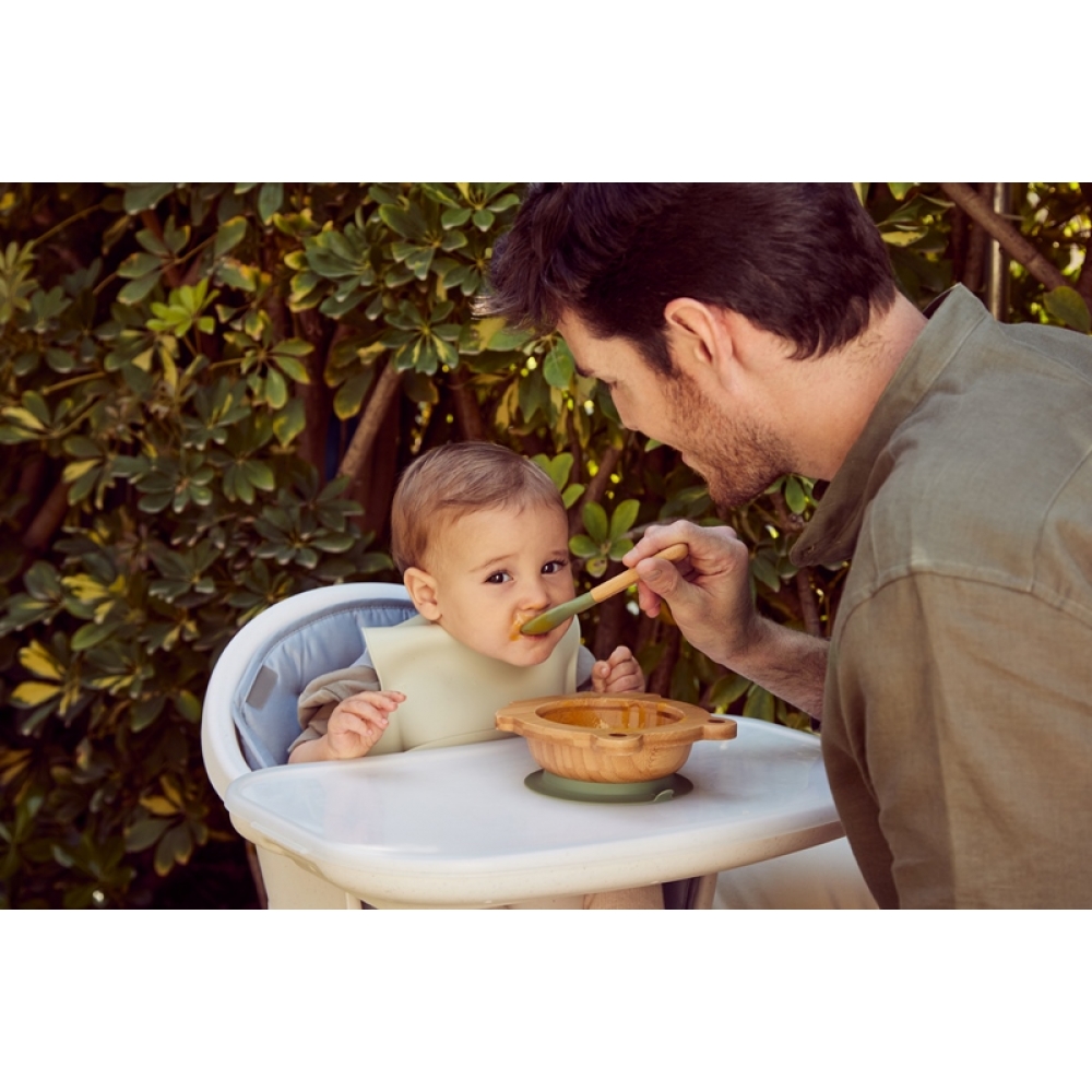 Набір складається з глибокої тарілочки та ложки з натуральних безпечних екологічно чистих матеріалів - 100% бамбука, сертифікованого FSC, та харчового силікону.
