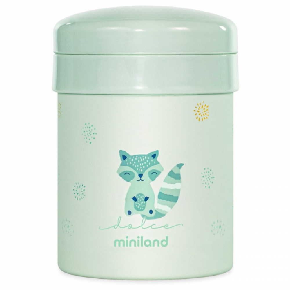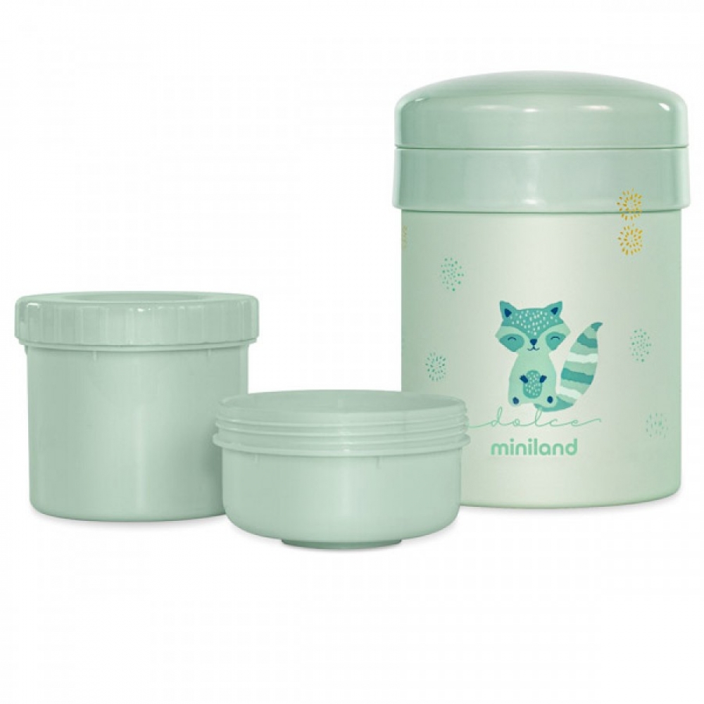 Харчовий термос із двома контейнерами Miniland Thermetic Mint має об'єм 700 мл і складається з двох внутрішніх контейнерів на 200 мл та 350 мл. Перший контейнер одягається в основну кришку термоса другий - може бути встановлений в саму колбу термоса і має окрему кришку. Такі контейнери підходять для всіх видів продуктів харчування - як для перших страв, так і твердої їжі. Їжу в них можна гріти у мікрохвильовій печі. При необхідності контейнери можна прибрати і використовувати весь об'єм термоса.