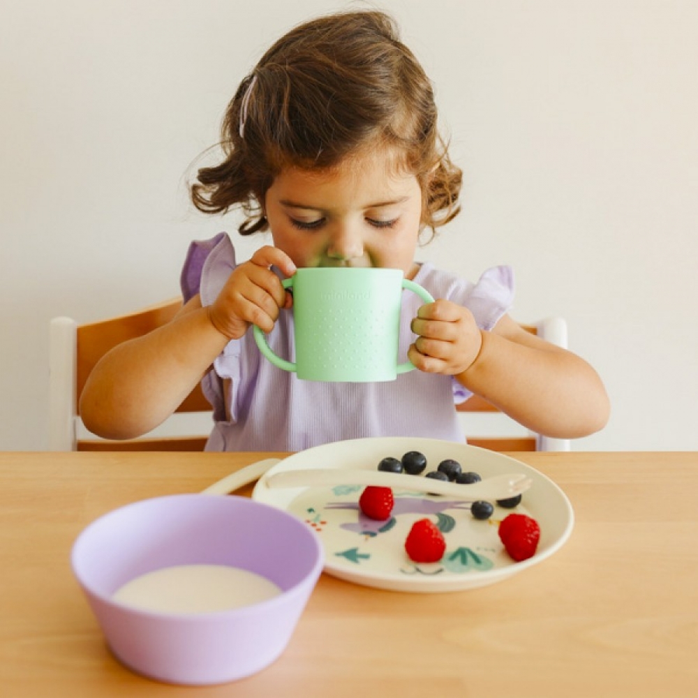 Набір дитячого посуду на 5 предметів ідеально підходить для переходу дитини до самостійного харчування. Він включає плоску тарілку з піднятими краями, глибоку мисочку, зручну чашку з текстурованими ручками для кращого захоплення дитячими ручками, а також ложку і вилку із закругленими краями, щоб запобігти пошкодженню ясен дитини. Набір виготовлений в Іспанії з безпечного міцного поліпропілену, який не вбирає запахи та легко очищується від забруднень, та не містить бісфенол А.