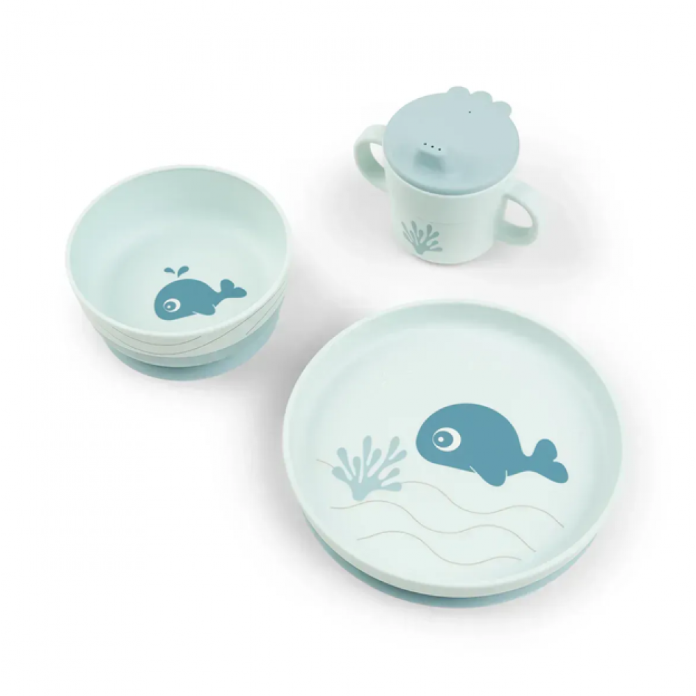 Веселий принт на тарілці, мисці та чашці створює позитивну атмосферу за столом, а продумана форма допомагає дитині вчитися їсти самостійно.