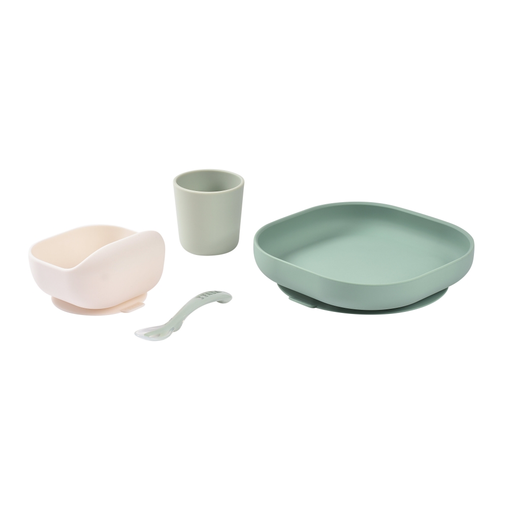 Набір: тарілка, миска, стакан, ложка Beaba 4+ оливковий/білий, арт. 913603