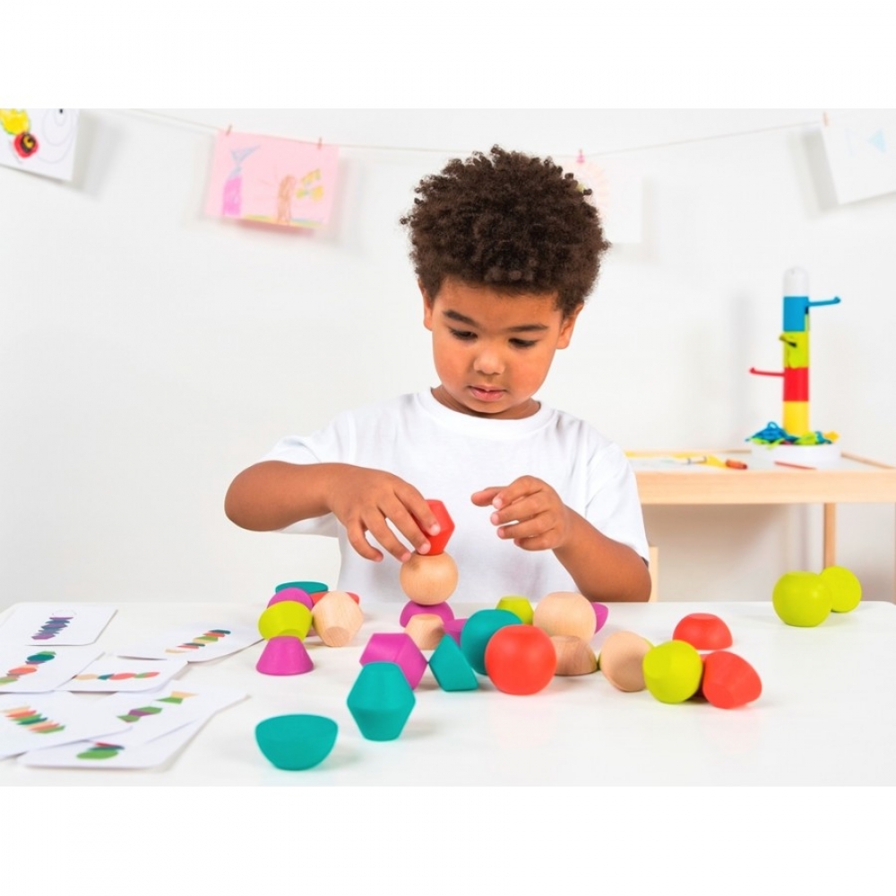 Ігровий набір складається з 30 різних дерев'яних геометричних форм, які можна ставити один на одного і створювати цікаві конструкції. Набір відмінно розвиває дрібну моторику, концентрацію уваги, логічне мислення і координацію, сприяє вивченню форм і кольорів. Деталі ідеально відшліфовані, виготовлені з високоякісного екологічно чистого матеріалу - дерева, і мають міжнародний сертифікат FSC. У комплекті до набору додається 16 карток із зображеннями варіантів збірки різного рівня складності.