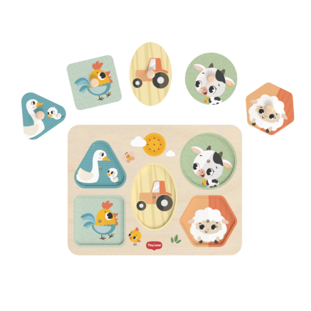 Інтерактивний дерев'яний пазл з 5 фігурами фермерських тварин та транспорту для малюків від 12 місяців. Коли малюк правильно вставляє фігурку — лунає весела мелодія! Це навчає форм, кольорів та причинно-наслідкових зв'язків через гру.