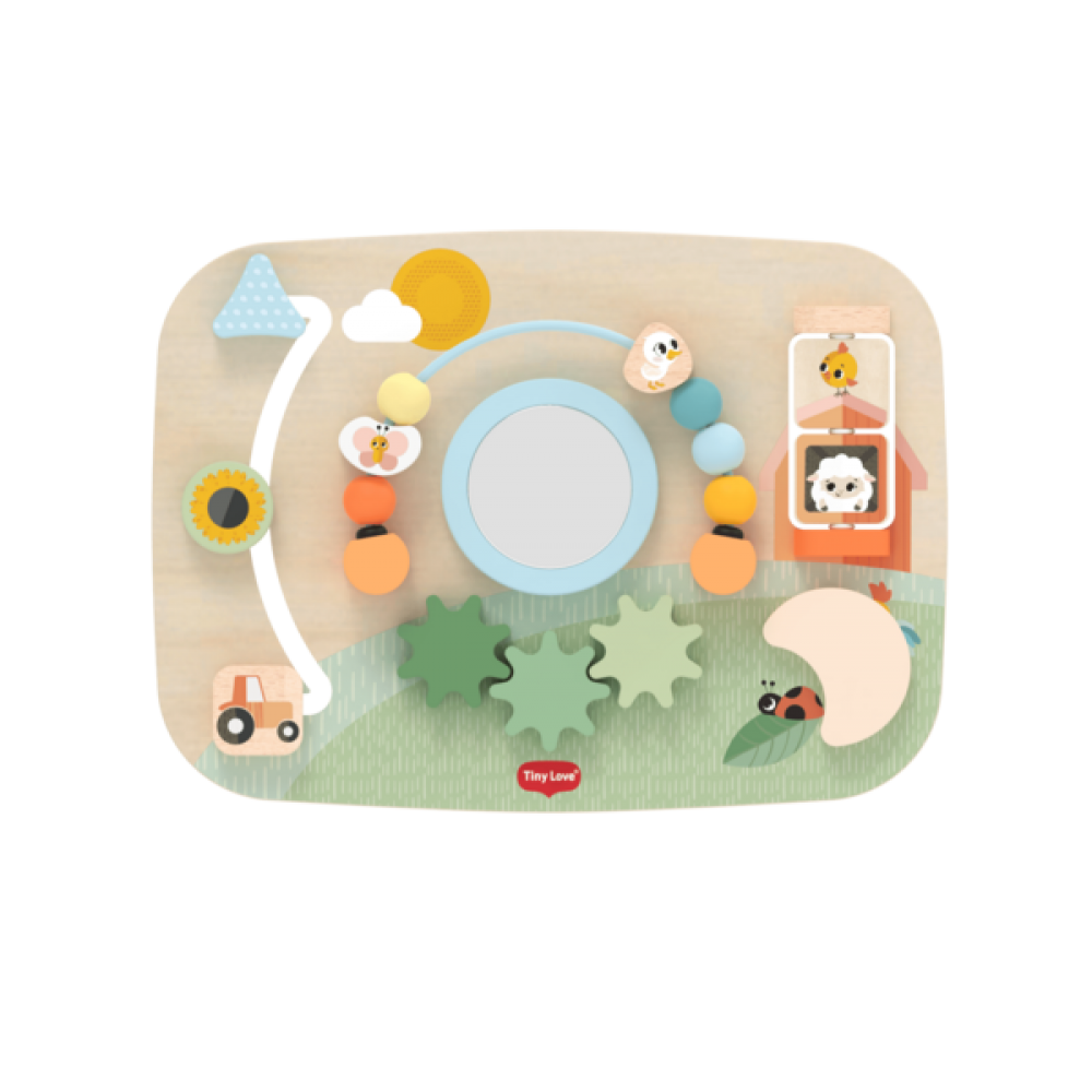 Інтерактивна дерев'яна дошка з вбудованими елементами для малюків від 9 місяців. Компактна та зручна — ідеальна для розвитку дрібної моторики, координації та когнітивних навичок через маніпуляції з різними механізмами.