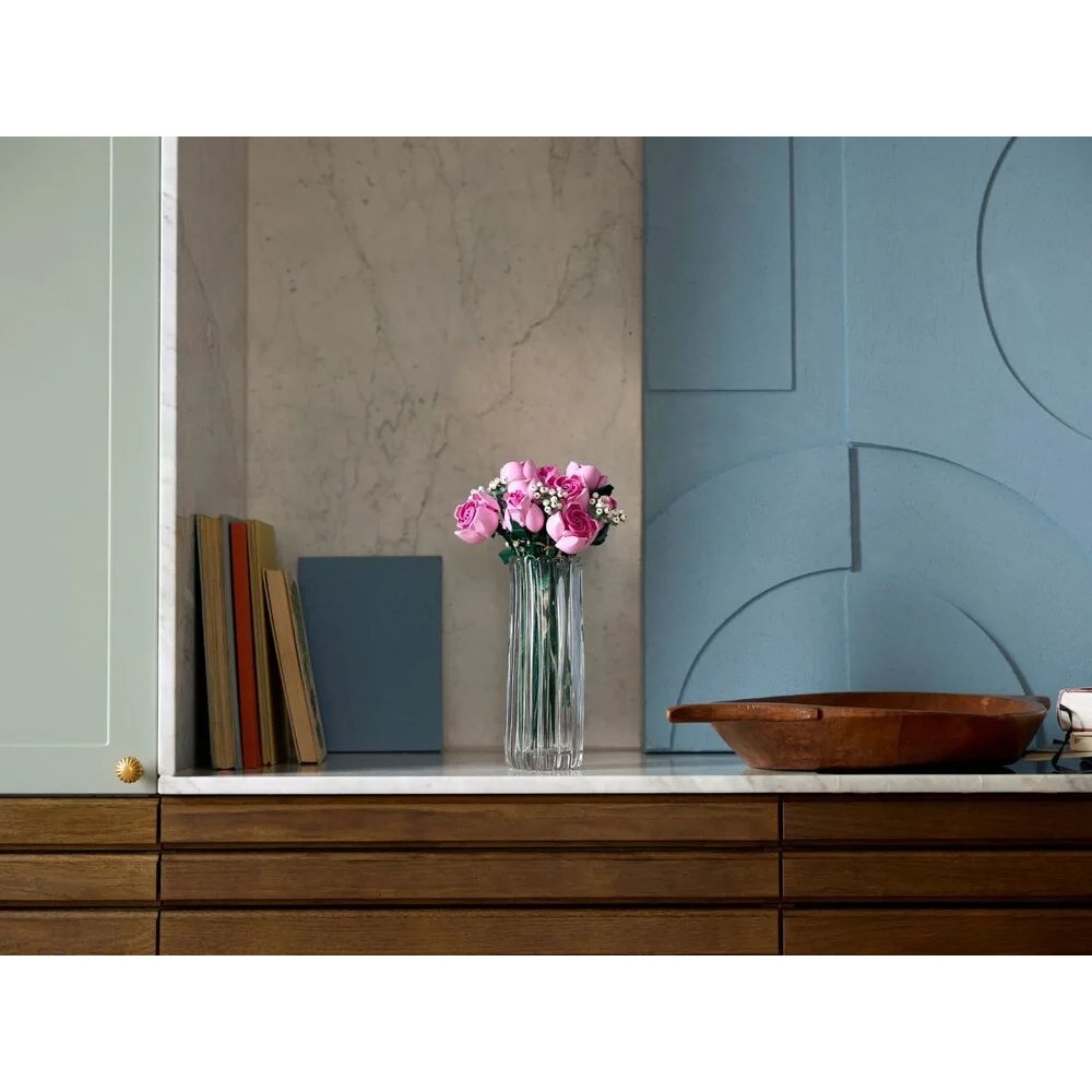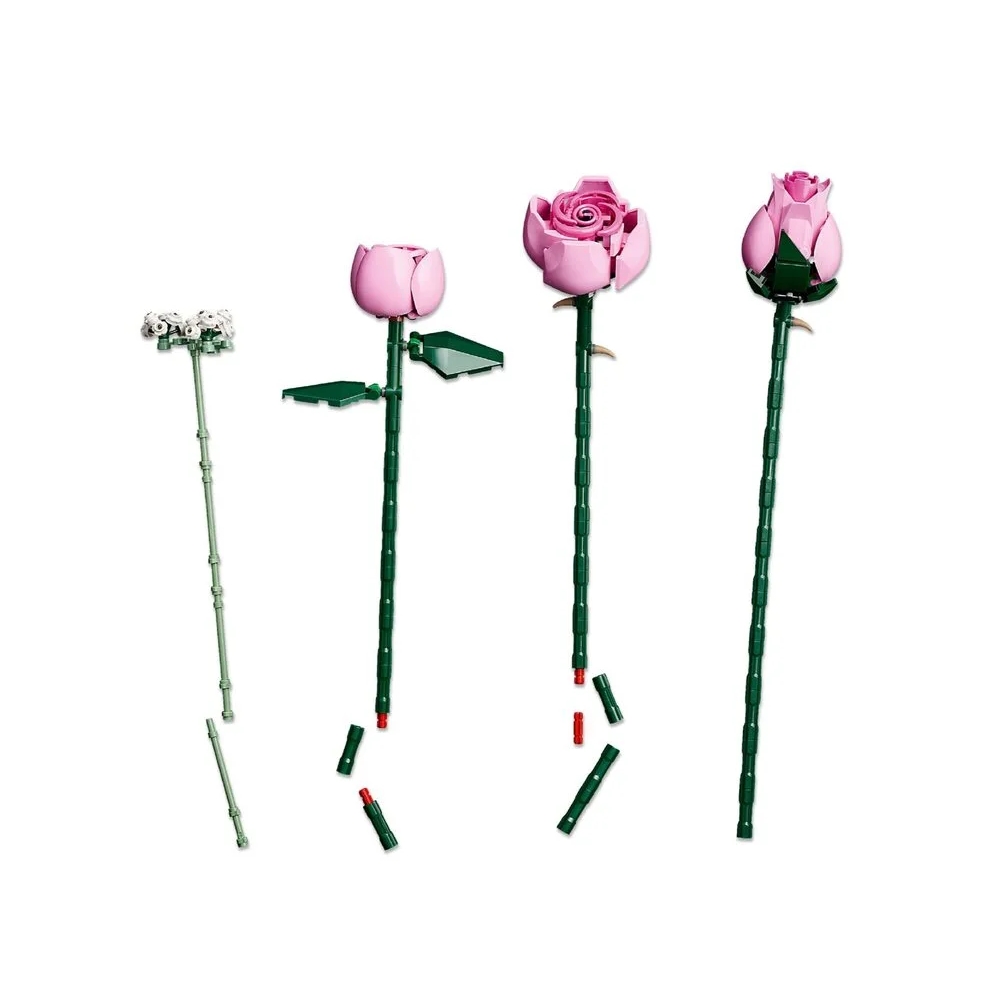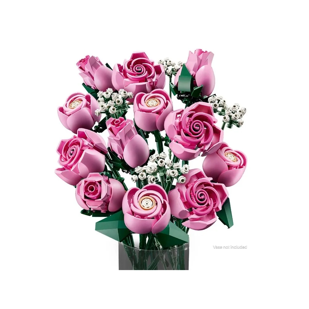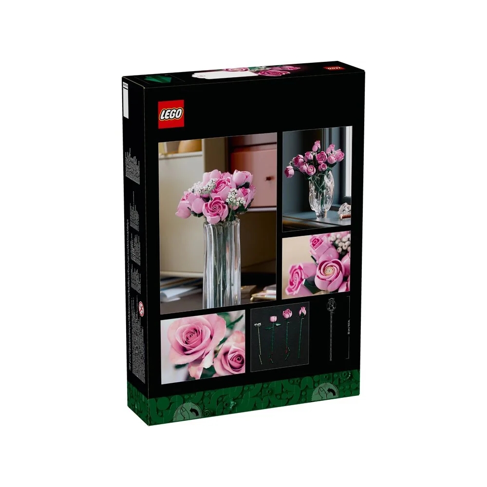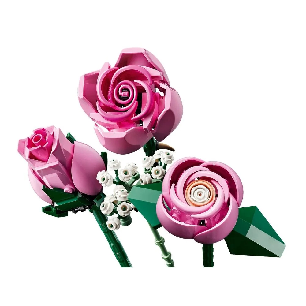 LEGO Botanicals Букет рожевих троянд (10374) дозволяє створити елегантну квіткову композицію з кубиків. У наборі 12 троянд на різних етапах цвітіння та гілочки лищиці з білими квітами. Це стильний подарунок, який квітнутиме вічно.