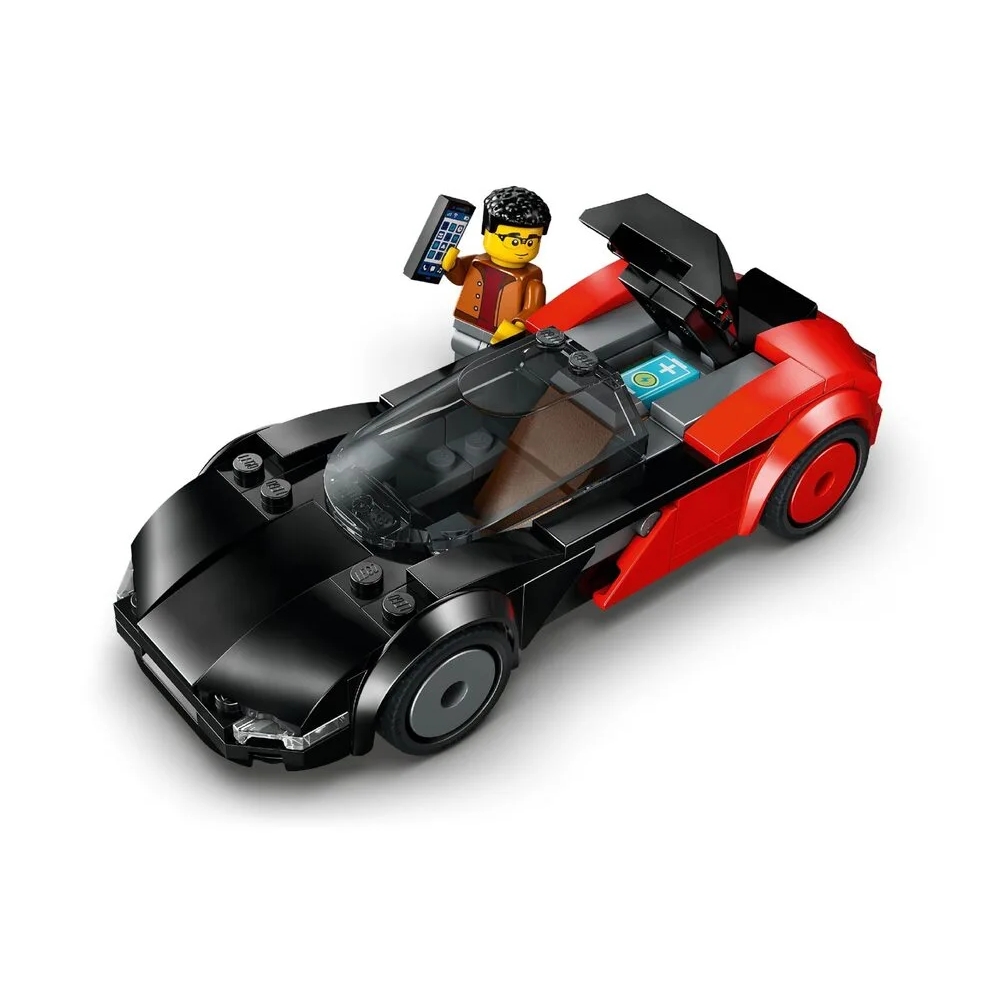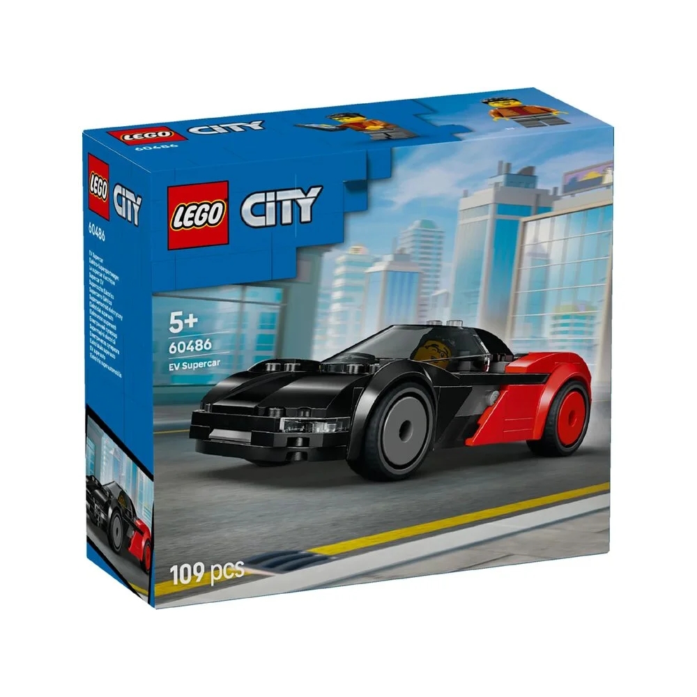 LEGO City Електричний суперкар (60486) — стильний набір для дітей від 5 років, що відтворює сучасний електромобіль з аеродинамічним кузовом у яскравій червоно-чорній гамі, низькопрофільними гумовими шинами, задньою світловою панеллю та тонованим салоном. Діти можуть відкрити задній люк, щоб дістати батарейний блок, посадити мініфігурку водія за кермо та уявляти динамічні поїздки містом чи перегони. Набір розвиває уяву, дрібну моторику та інтерес до екологічного транспорту. Чудовий подарунок для юних любителів сучасних електрокарів та швидкісних пригод. Містить 109 деталей та інструкції в додатку LEGO Builder з 3D-переглядом.