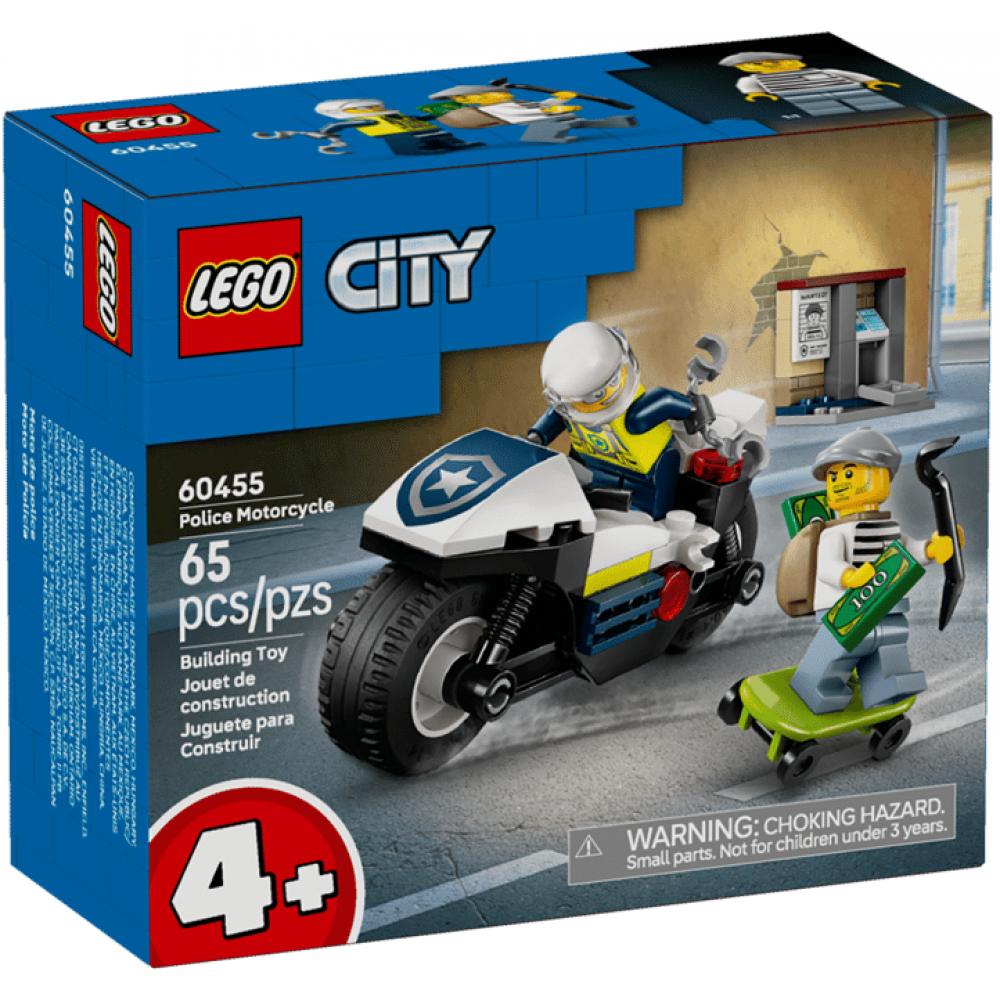 Захопливе переслідування на поліцейському мотоциклі LEGO City (60455) — динамічний набір для дітей від 4 років! Крутий мотоцикл з широкими шинами, скейтборд для втечі злодіїв і міні-банкомат, що відкривається з іграшковою банкнотою — ідеально для швидких пригод і творчих історій!