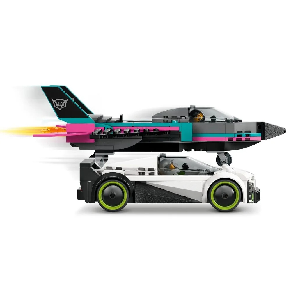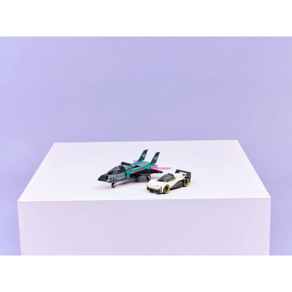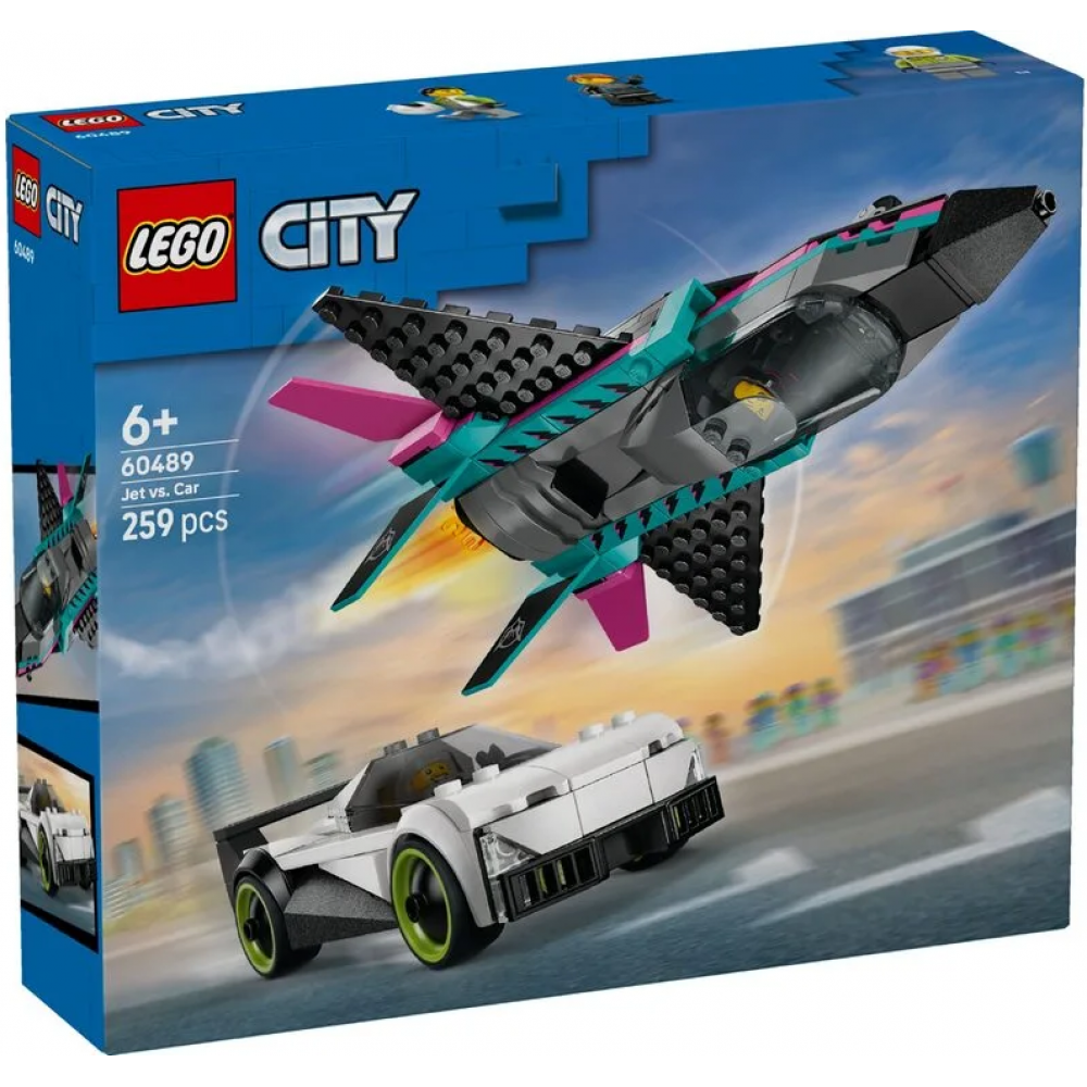 LEGO City Реактивний літак проти автомобіля (60489) — динамічний набір для дітей від 6 років, що містить два швидкісні транспортні засоби: надзвуковий реактивний літак з відкидними крилами, подвійним вертикальним хвостом і стабілізаторами та суперкар з деталізованим салоном і сидінням для перегонів. Діти можуть посунути важіль, щоб увімкнути форсаж реактивного двигуна, та відкрити кабіну суперкара для рольових ігор. У комплекті мініфігурки пілота та водія для епічних перегонів і сюжетів. Набір розвиває уяву, швидкість реакції та любов до змагань. Містить 259 деталей та інструкції в додатку LEGO Builder з 3D-переглядом.