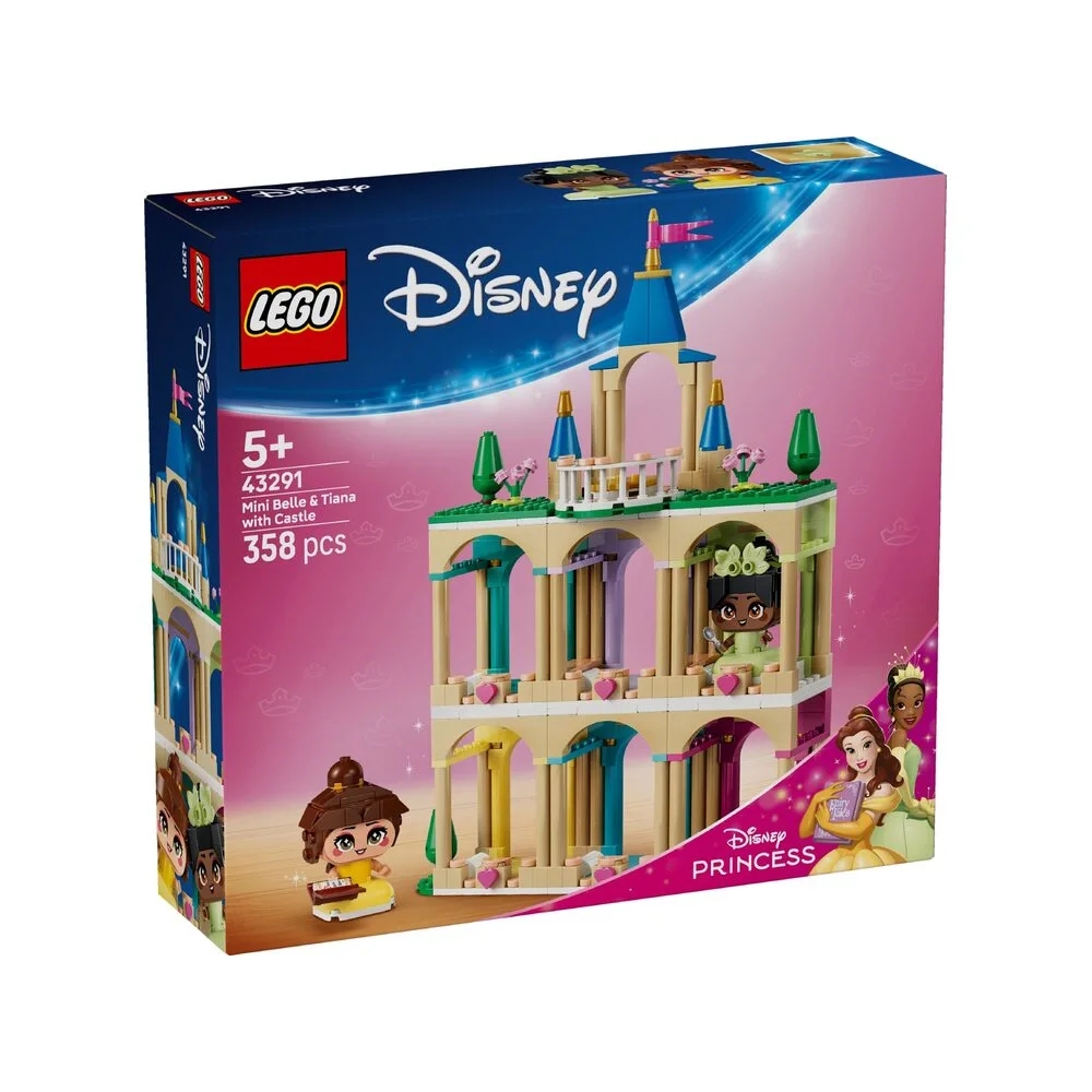 LEGO Disney 43291 — це чарівний набір для дітей від 5 років з двома рухомими мініпринцесами: Бель (з книжкою) та Тіаною (з ложечкою) з мультфільмів Disney. Доданий трирівневий замок з кімнатами в кольорах кожної принцеси, центральна вежа з обертовою платформою для демонстрації фігурок та аксесуари для сюжетних ігор. Це ідеальний спосіб розвивати уяву через історії принцес та використовувати модель як милу експозицію. Додаток LEGO Builder з 3D-інструкціями полегшує складання. Чудовий подарунок для фанатів Бель, Тіани та колекції Disney Princess.