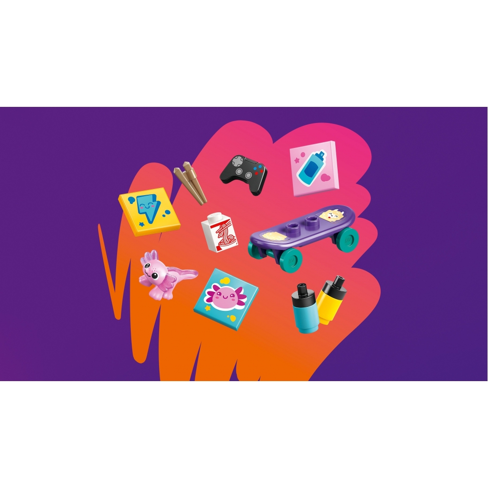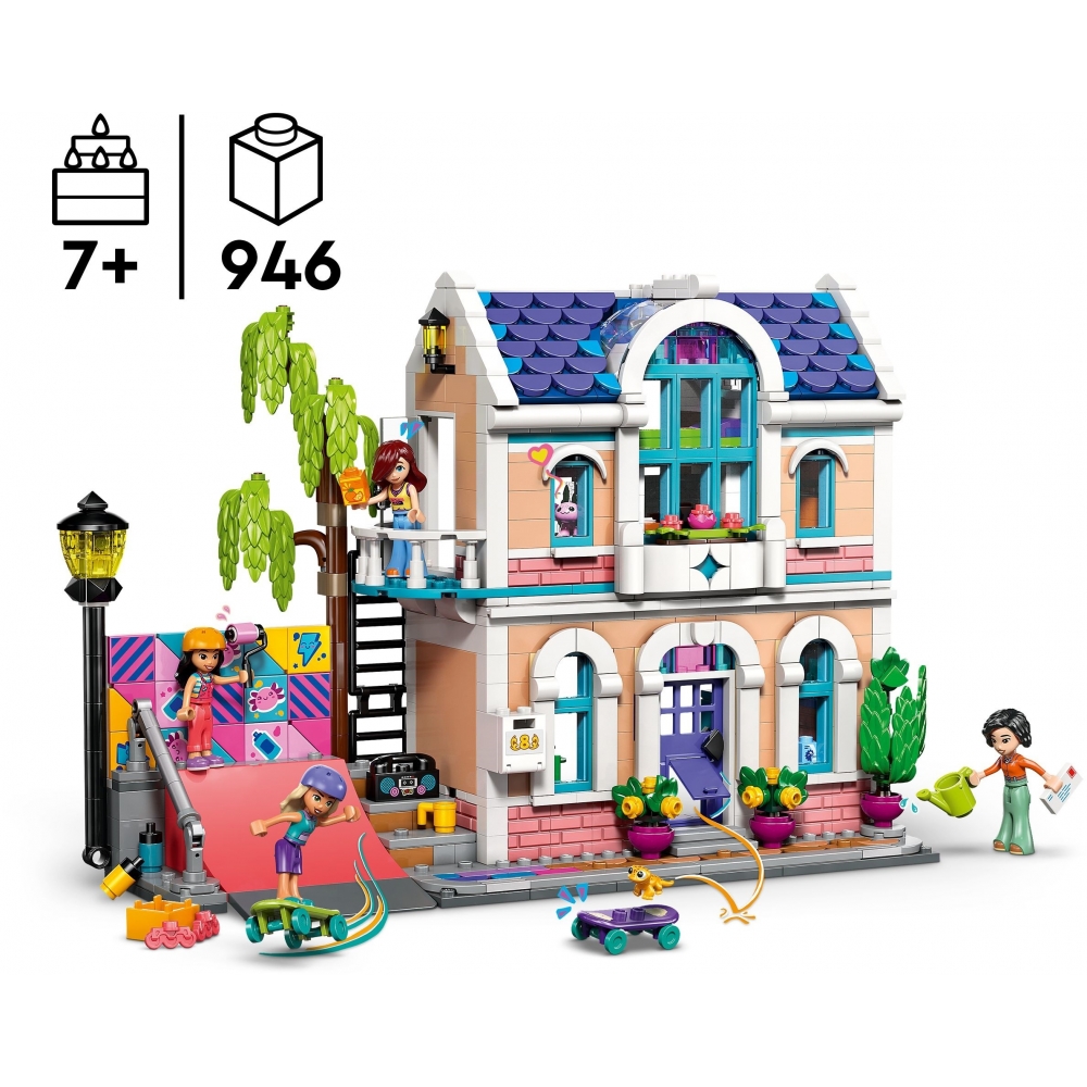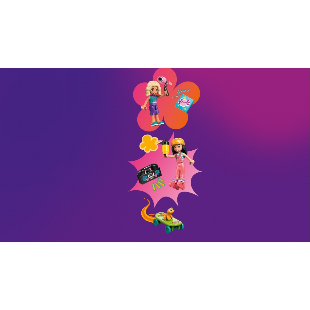 LEGO Friends 42687 — набір для дітей від 7 років із будиночком, що має кухню, вітальню, спальню, балкон і сад. У комплекті 4 мініляльки, гекон, аксолотль, скейтборди, художнє приладдя, бумбокс, письмовий стіл, тераріуми, палички, коробки для локшини, соєвий соус, молоко та апельсиновий сік. Діти можуть розігрувати сюжети про хобі, творчість, догляд за тваринами та повсякденне життя. Знімні плитки дозволяють персоналізувати фреску. Додаток LEGO Builder з 3D-інструкціями спрощує процес складання.
