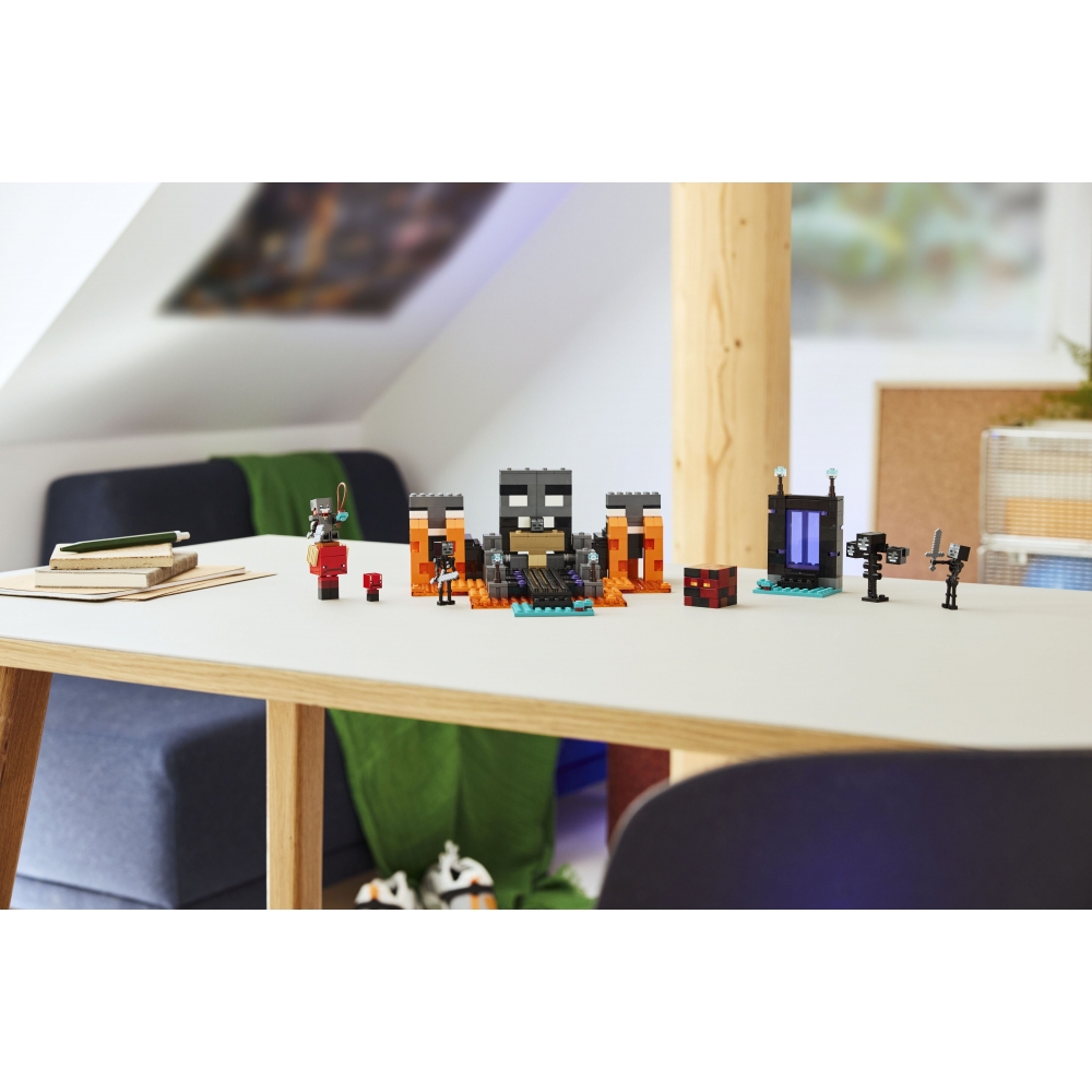 LEGO Minecraft Битва за Візер 21590 відтворює епічну сутичку з Minecraft у форматі конструктора з автентичними ігровими елементами. Набір включає портал у Нижній світ, вівтар та багато персонажів, готових до бою. Є можливість «спровокувати» появу Візера через вибухову ігрову функцію. Включені аксесуари сприяють сюжетній грі та створенню сцен.