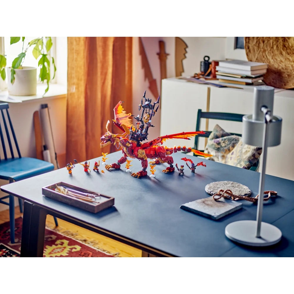 Діти віком від 12 років оживляють повітряні пригоди з другого сезону серіалу NINJAGO® Повстання драконів завдяки цій дивовижній пригодницькій іграшці «Першодракон руху» (71822). Це найбільший в історії LEGO® іграшковий дракон, що має рухливі кінцівки, хвіст, стегна, щелепи, голову, шию і великі крила.