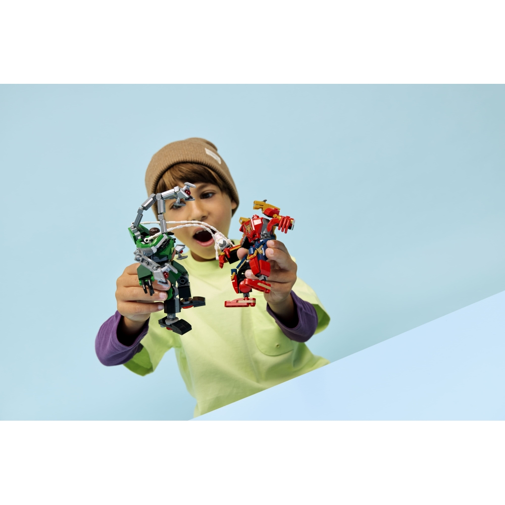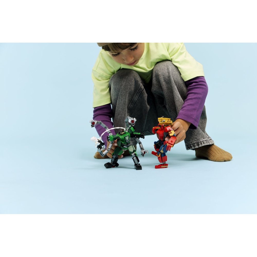 Приєднуйтесь до 2 повністю рухомих роботів для надзвичайних пригод супергероїв із набором «Битва роботів: Людина-павук vs. Доктор Восьминог» (76338) — конструктором для хлопчиків і дівчаток віком від 6 років. Діти можуть ставити 2 роботів у різні пози, щоб оживити пригоди разом із мініфігурками LEGO® ǀ Marvel: Людина-павук, Павук-привид і Доктор Восьминог. Обидва роботи мають високу рухливість для максимальної динамічності й кабіну, що відкривається, де можна розмістити мініфігурку пілота.