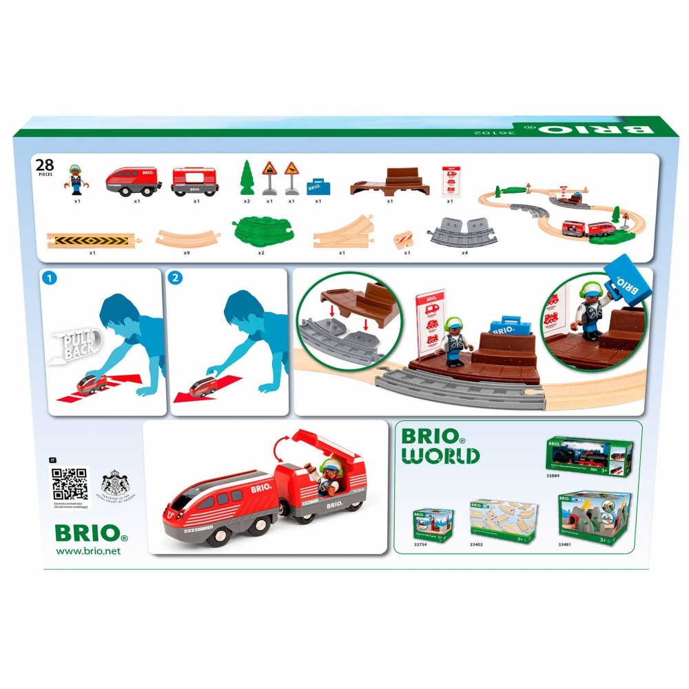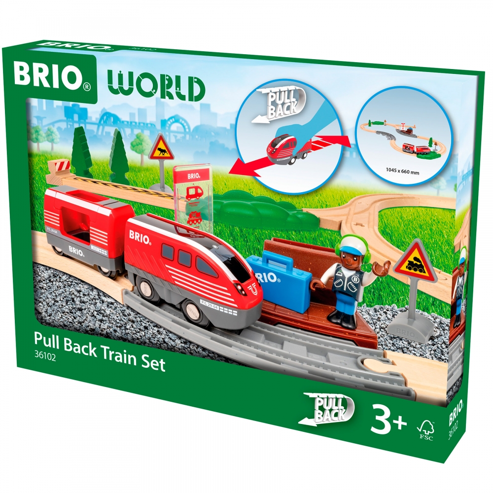 BRIO Pull Back Train Set (36102) — це яскравий набір дитячої залізниці, який працює на енергії самої дитини! Просто відтяни потяг назад, відпусти — і спостерігай, як він мчить уперед без жодних батарейок.