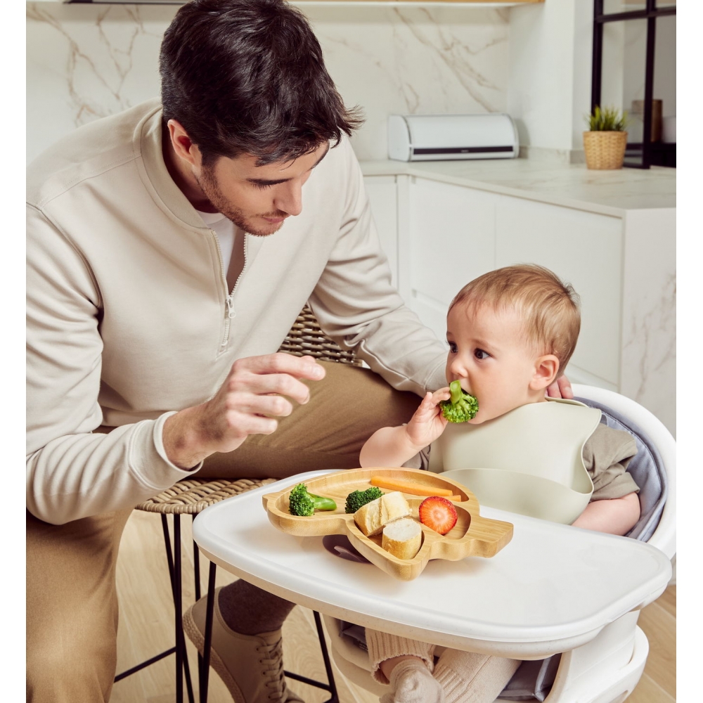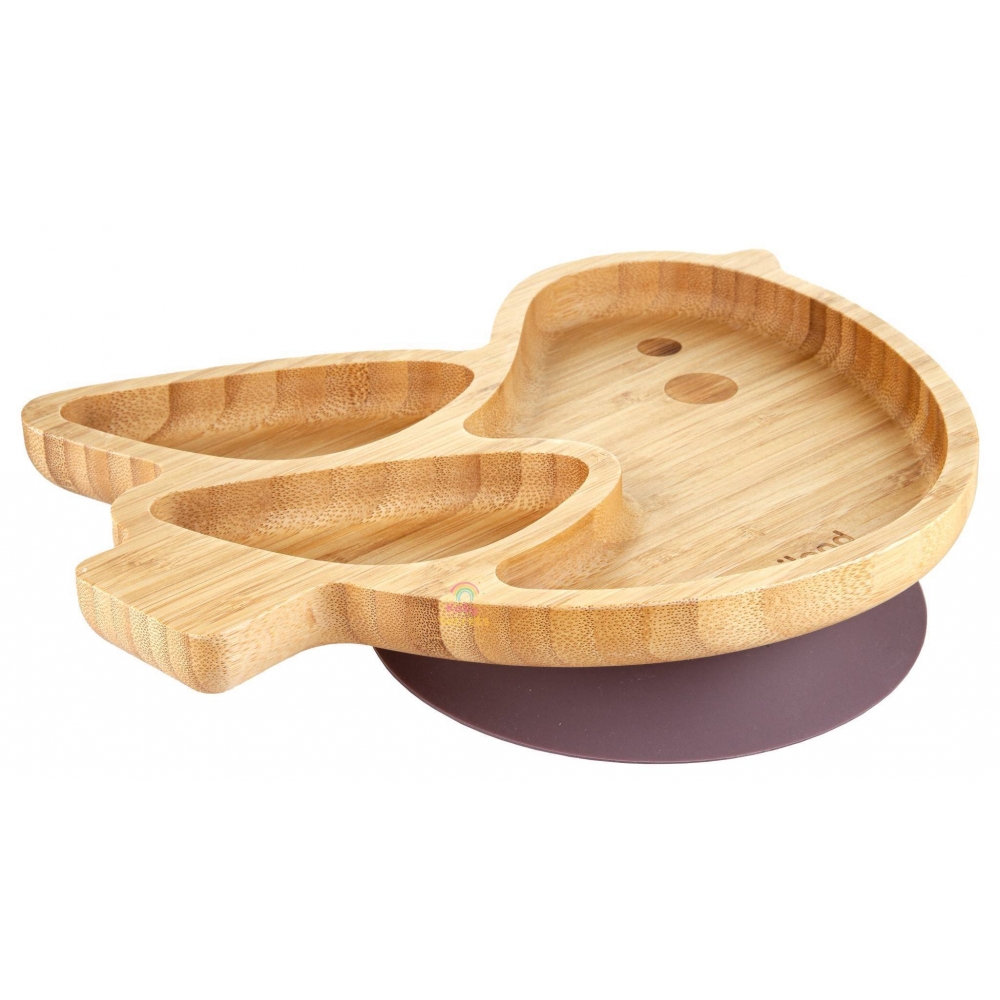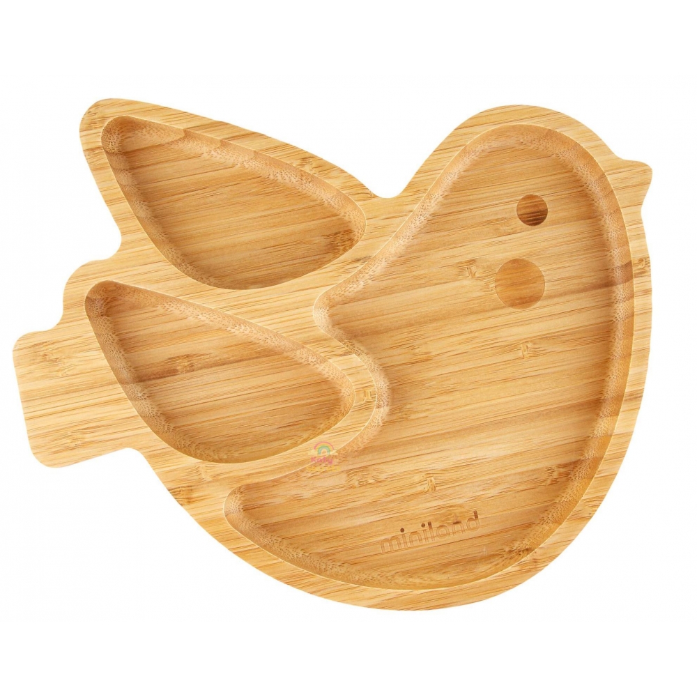 Тарілка у формі кумедного курчати та виготовлена з натурального екологічно чистого матеріалу - бамбука. Складається з трьох секцій (одна велика та 2 маленькі), для поділу продуктів. Щоб малюк не перекинув тарілку, вона має силіконову присоску на підставі, тому вона легко і надійно кріпиться до дитячого стільця для годування. або столу.