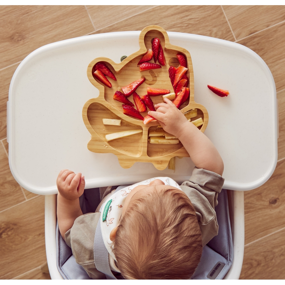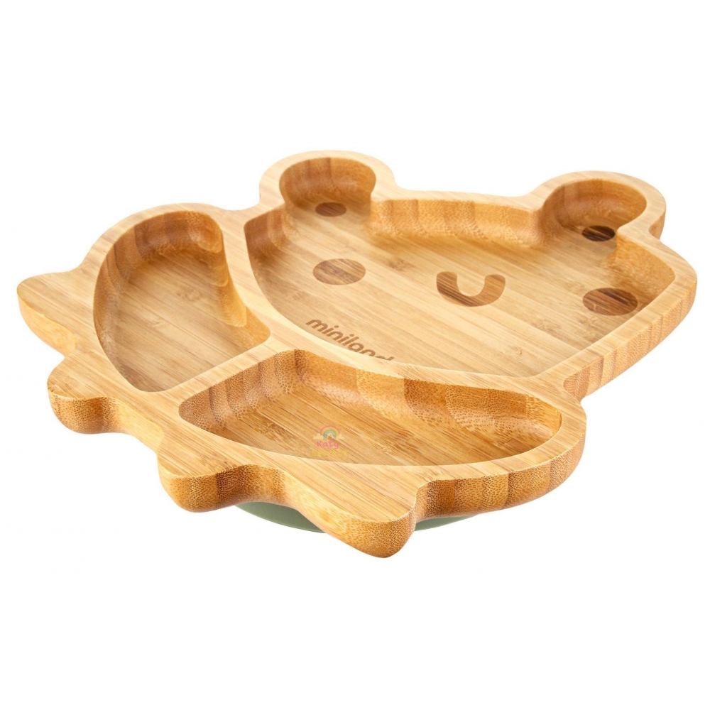 Тарілка у формі кумедного жабка виготовлена з натурального екологічно чистого матеріалу - бамбука. Складається з трьох секцій ( одна велика та 2 маленькі), для розподілу продуктів. Щоб малюк не перекинув тарілку, вона має силіконову присоску на підставі, тому вона легко і надійно кріпиться до дитячого стільця для годування. або столу.