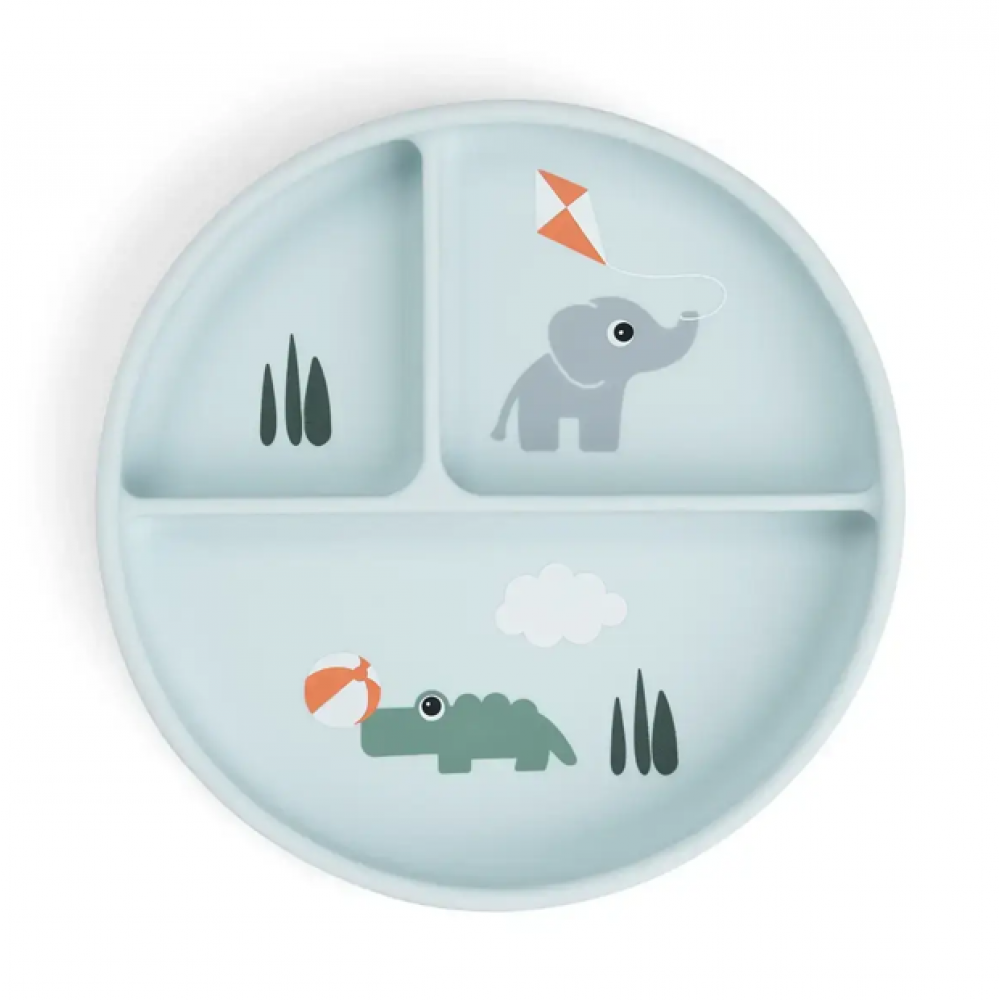 Секційна тарілка Done by Deer серії Stick & Stay у блакитному кольорі лінійки Playground — це функціональний і безпечний аксесуар для годування, виготовлений зі 100% харчового силікону. Виріб оснащений потужною основою-присоскою, яка надійно фіксує тарілку на поверхні столу, запобігаючи її перевертанню, падінню чи штовханню дитиною під час трапези. Тарілка розділена на кілька відділень, що ідеально підходить для сервування різних видів їжі окремо, допомагаючи малюку вивчати нові смаки та текстури. Модель прикрашена фірмовими ігровими принтами, вона є надзвичайно міцною, витримує температури від -40°C до 230°C та підходить для миття в посудомийній машині й використання в мікрохвильовій печі.
