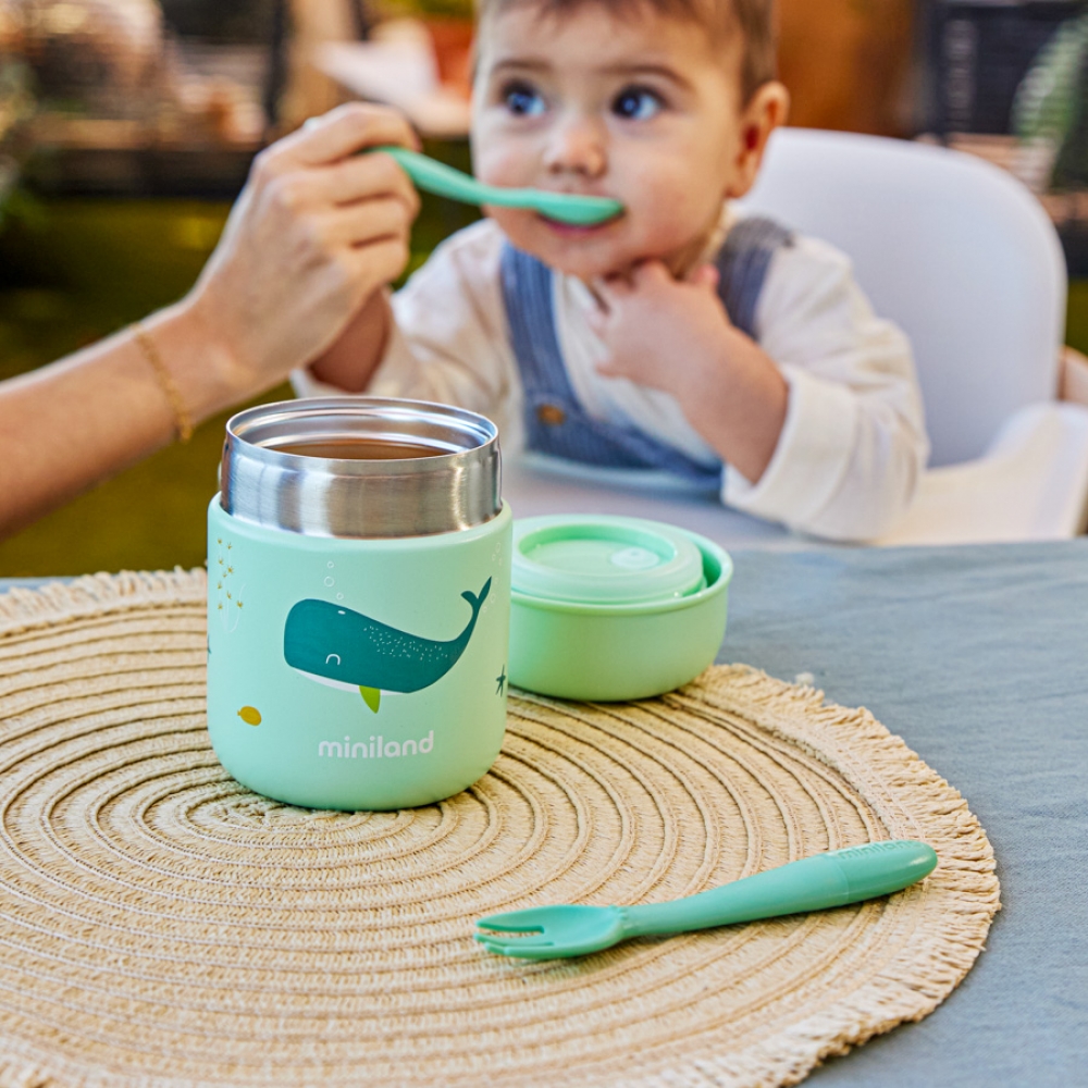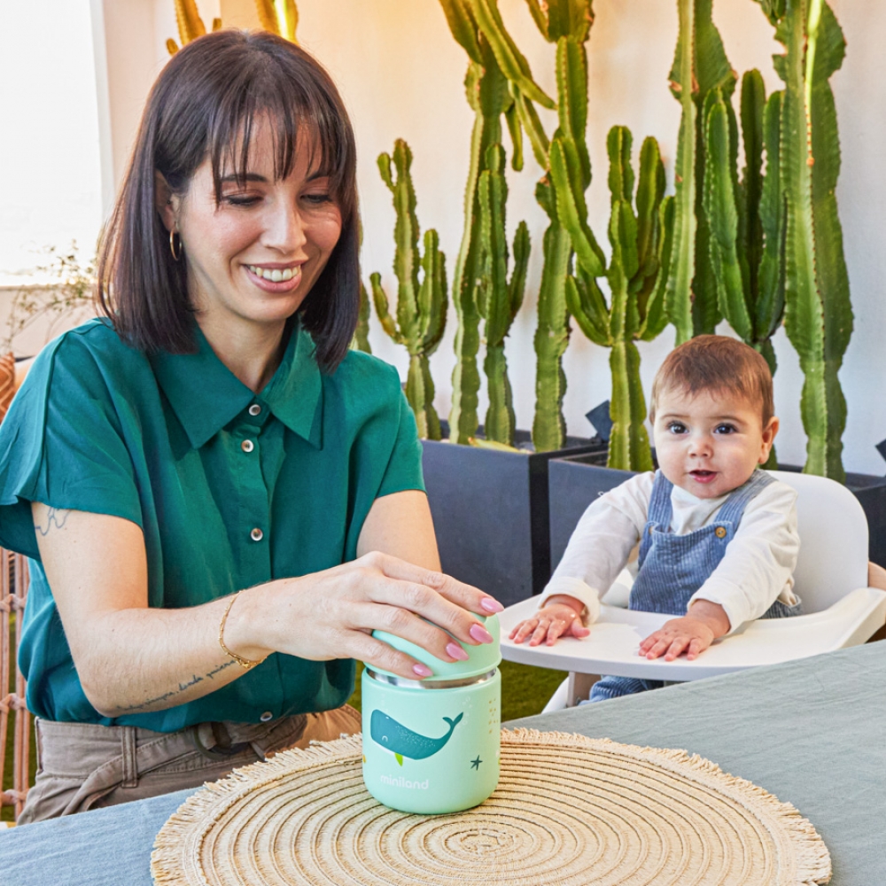 Харчовий термос ідеально підходить для зберігання дитячої їжі та страв першого прикорму. На відміну від термосів інших брендів термос Miniland відмінно зберігає температуру вмісту завдяки подвійним сталевим стінкам, алюмінієвому шару та двокамерній системі.