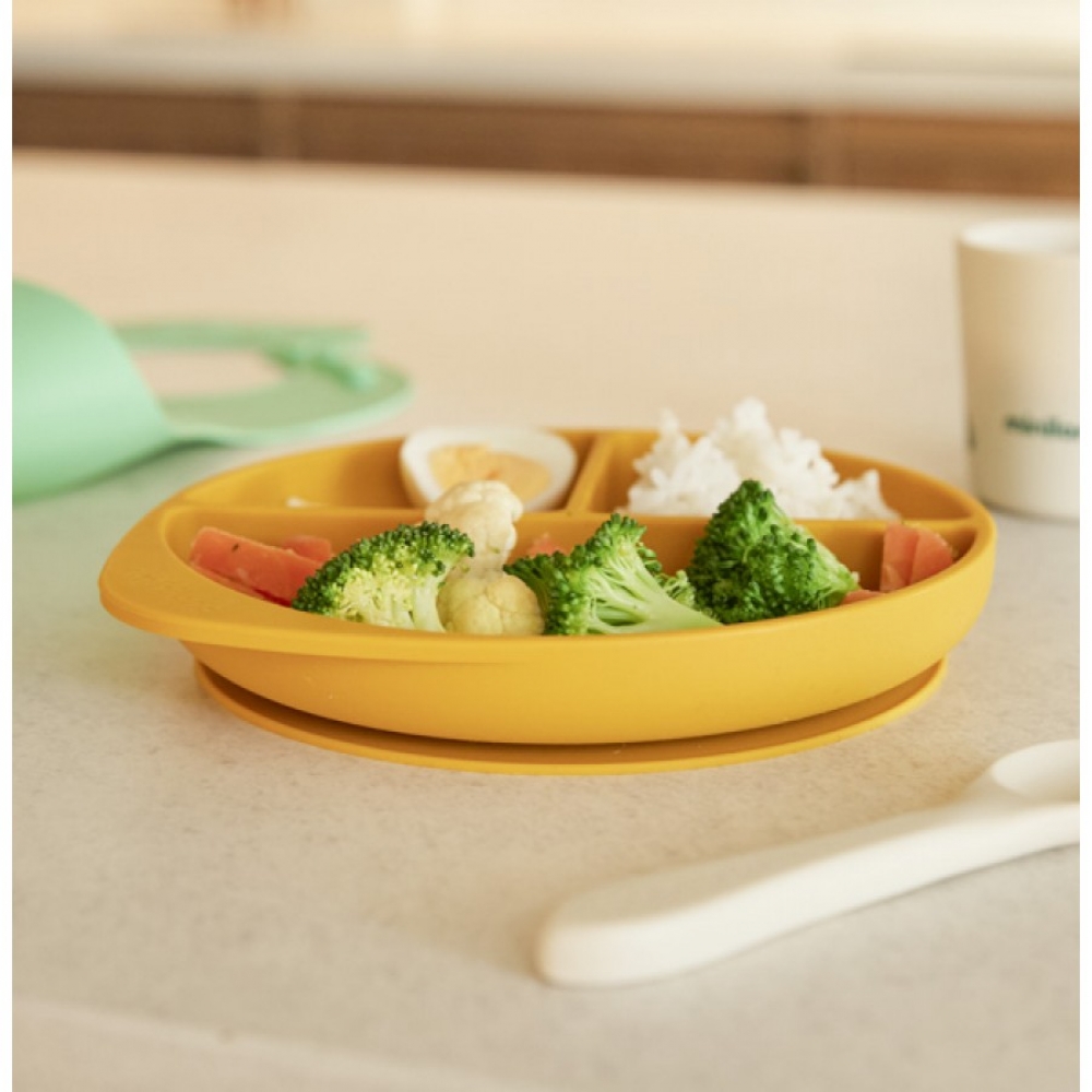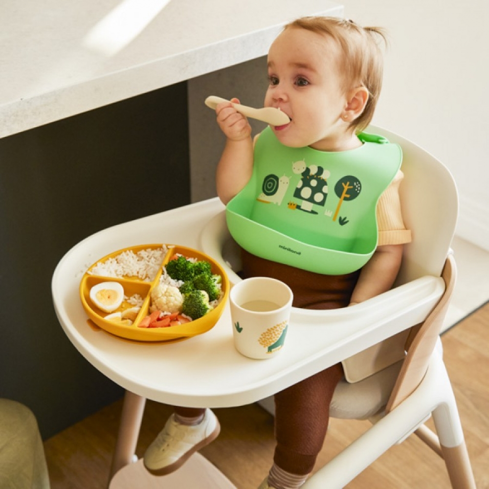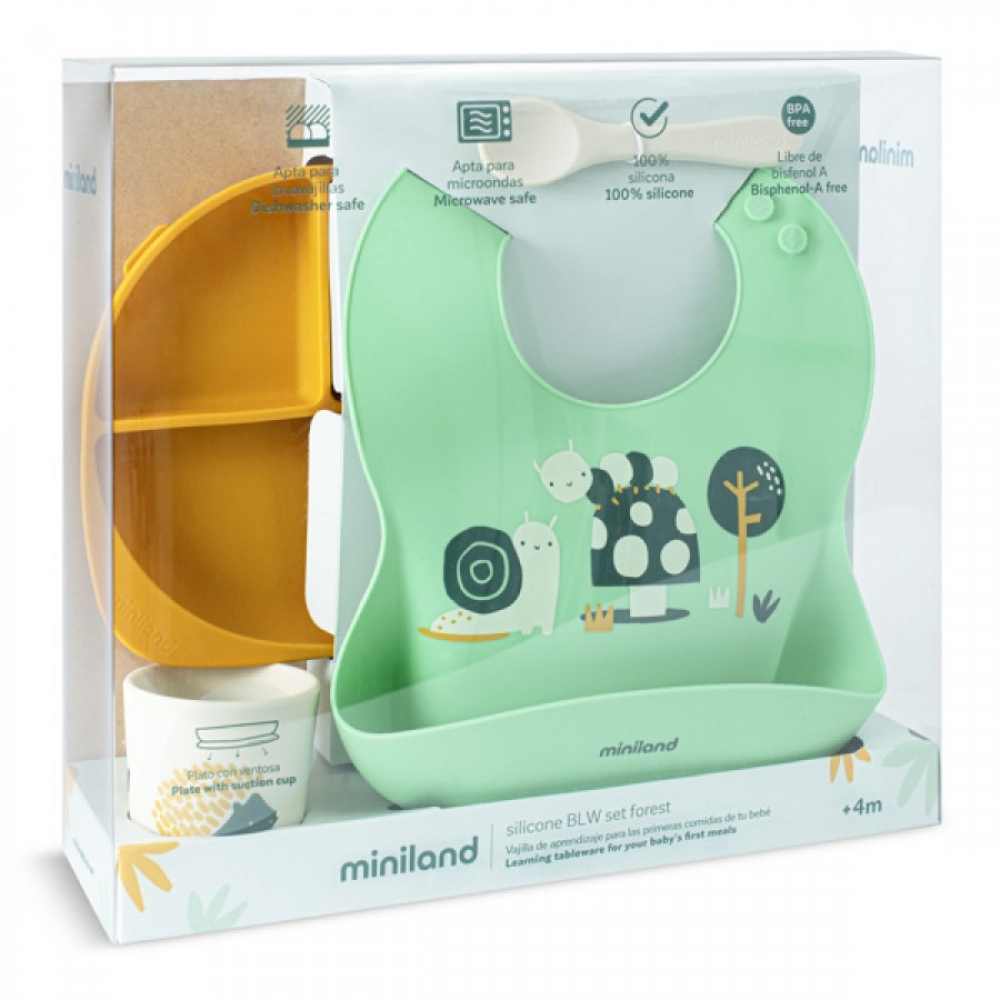 Силіконовий дитячий посуд Set Garden від Miniland - ідеальний вибір для того, щоб познайомити вашого малюка із самостійним годуванням за допомогою методу Baby Led Weaning (BLW). Набір складається з секційної тарілочки з 3 секціями для поділу страв, ергономічної ложки, стаканчика для напоїв, а також нагрудника з великою кишенею для збору крихт.